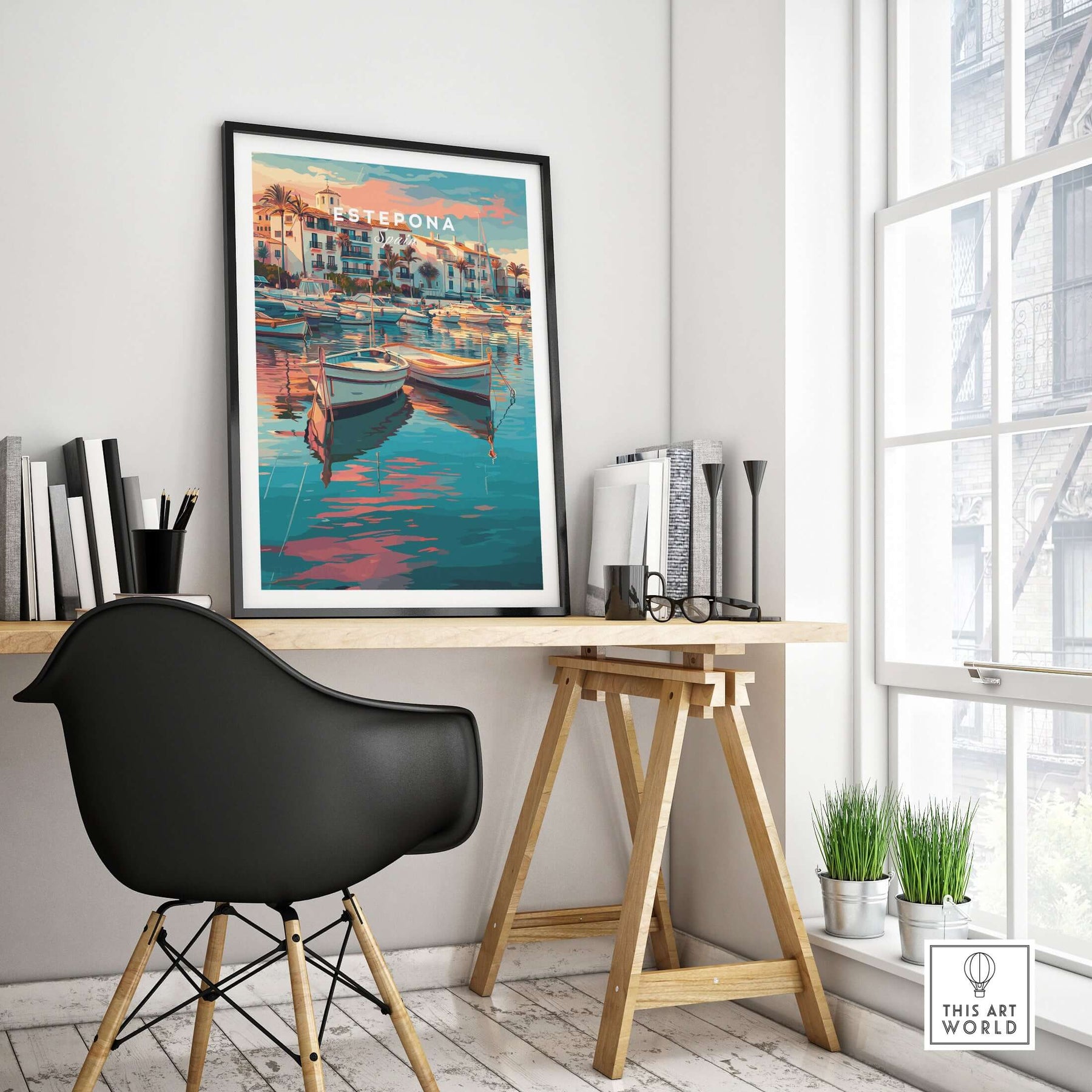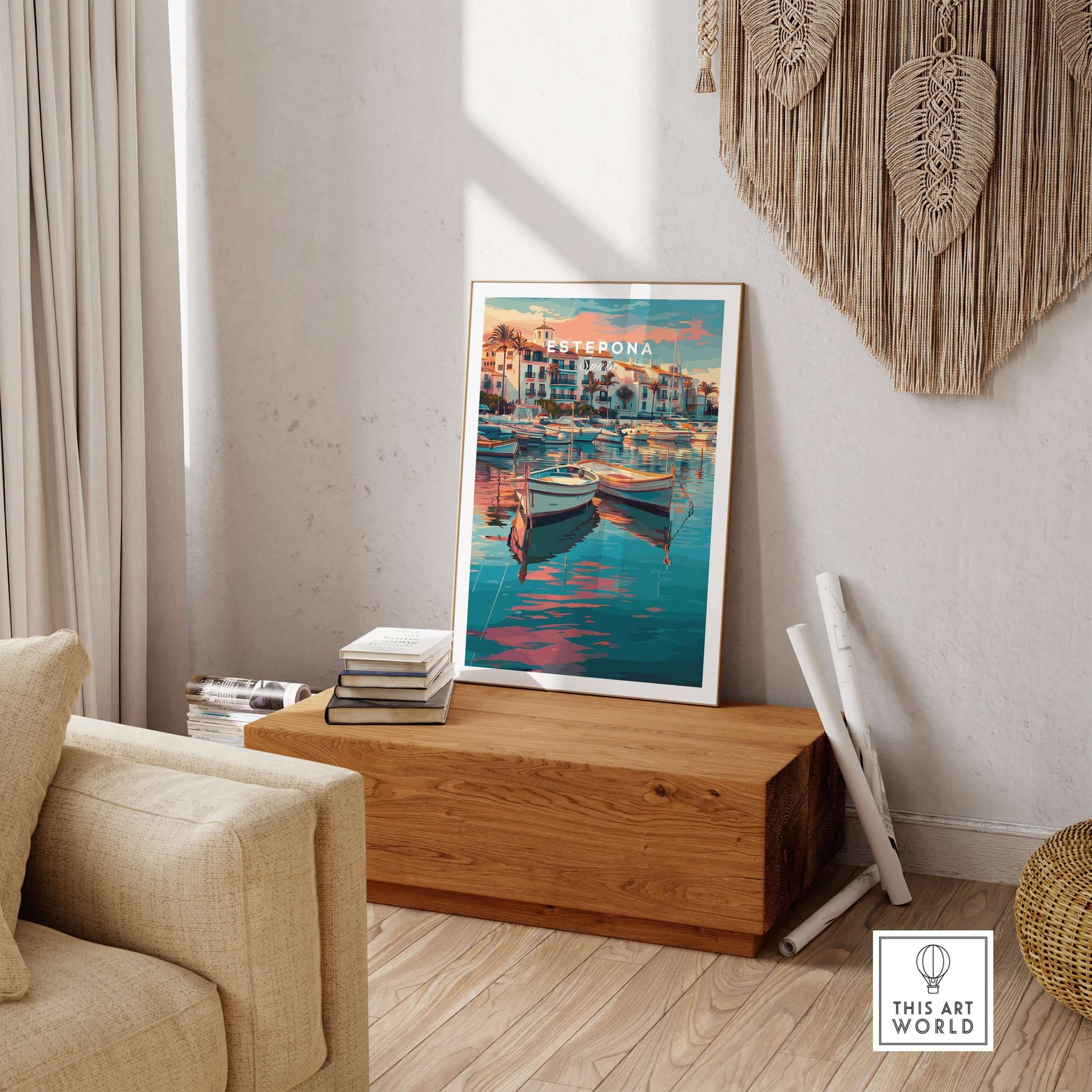 Estepona Boats Harbour Reflection Print | Mediterranean Wall Decor displayed in a sunny room beside a window.