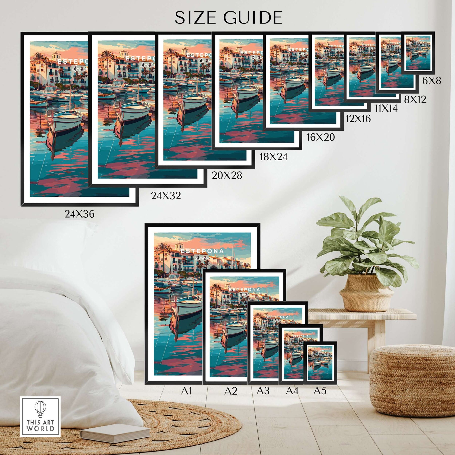 Estepona Boats Harbour Reflection Print | Mediterranean Wall Decor size guide showing various frame dimensions.