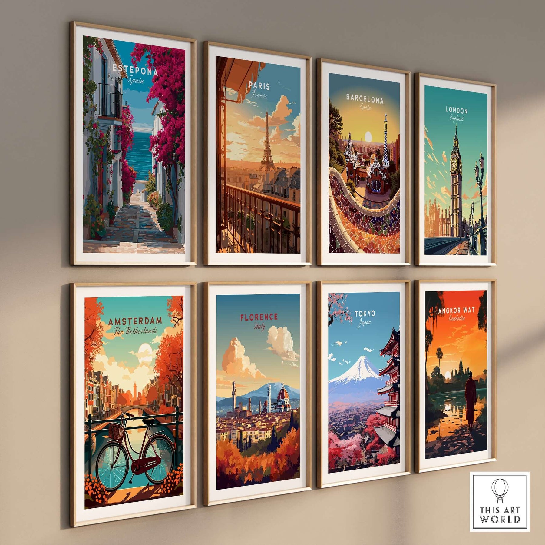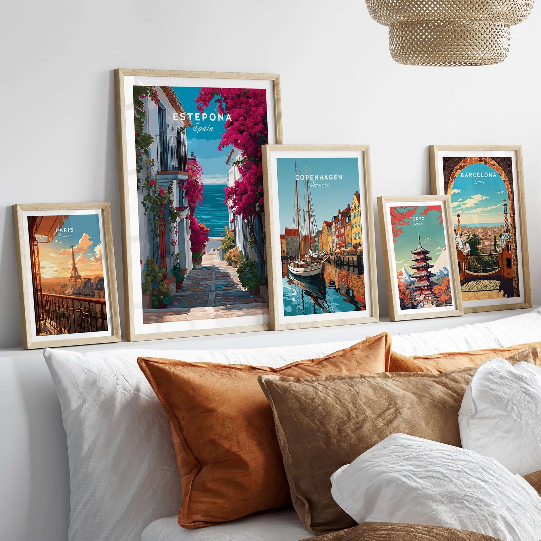 Estepona Old Town Sea View Print | Mediterranean White Village Decor displayed in a gallery wall of vibrant travel prints.