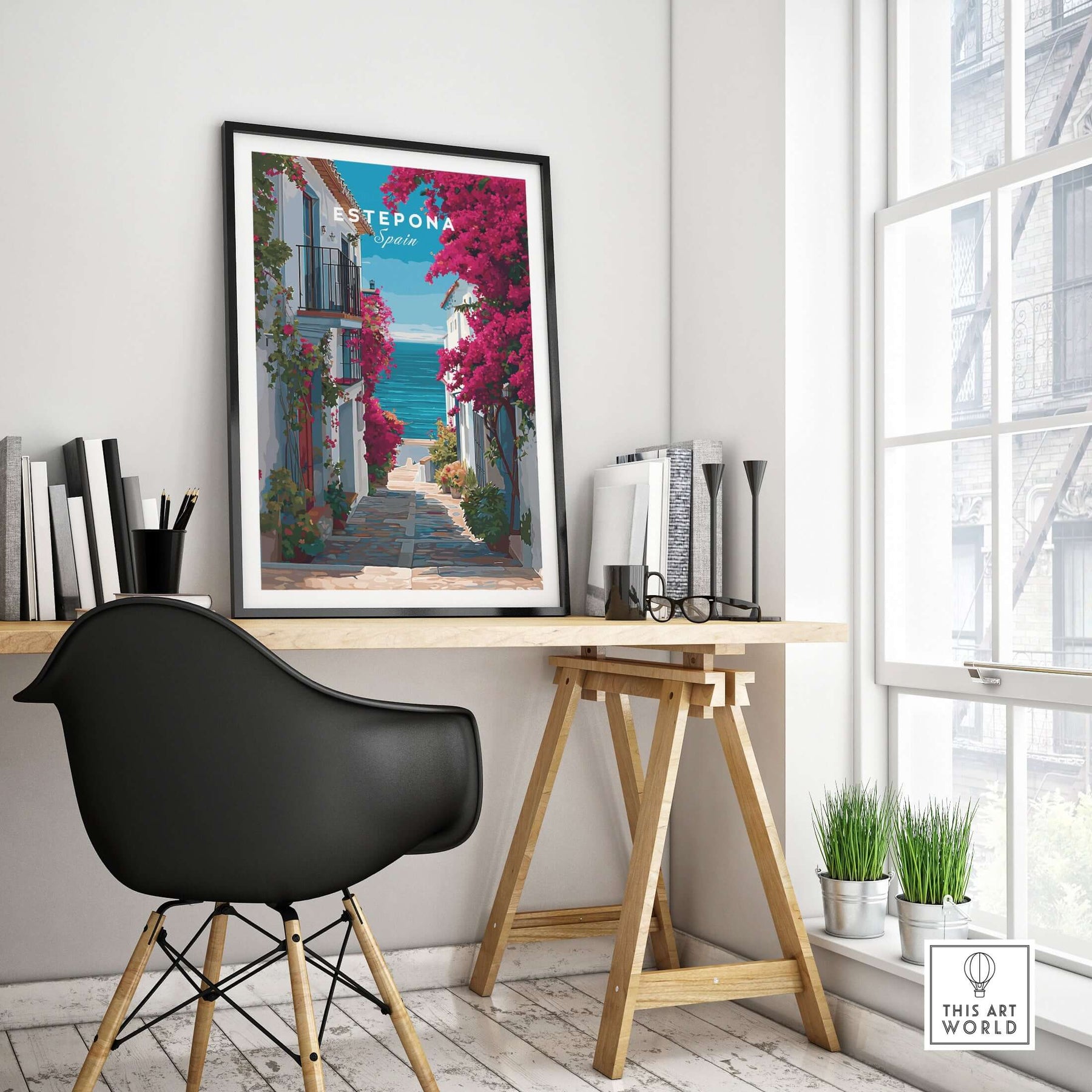 Estepona Old Town Sea View Print | Mediterranean White Village Decor in a stylish home office setting.