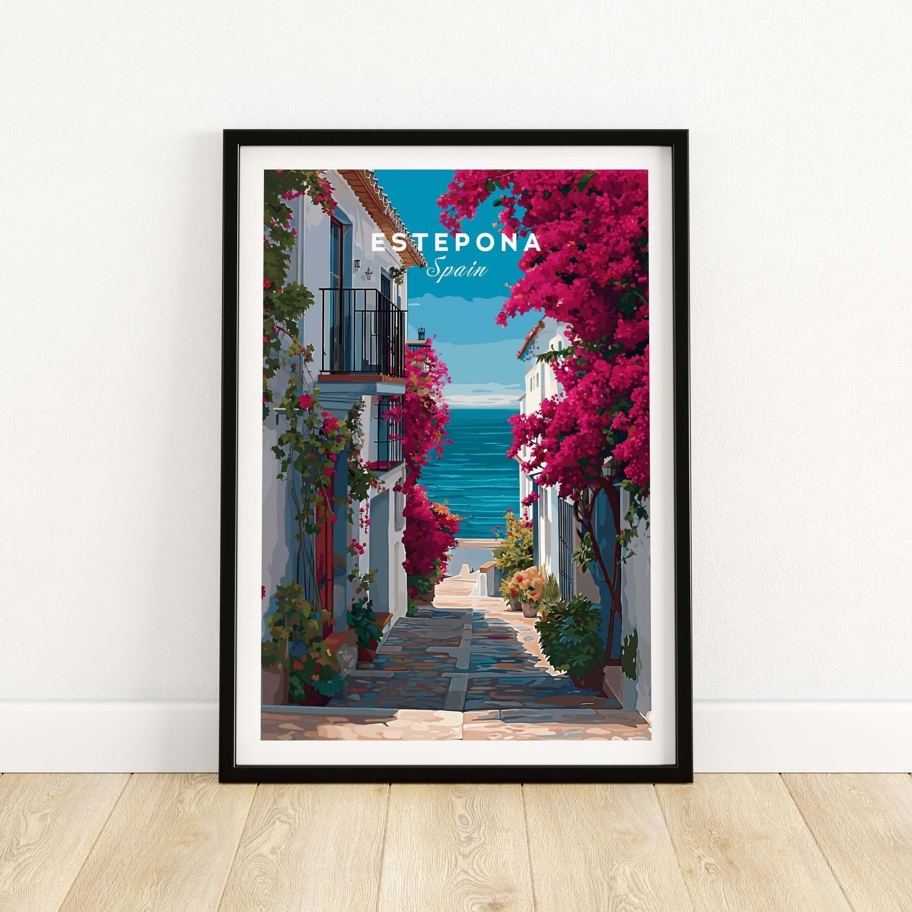 Estepona Old Town Sea View Print | Mediterranean White Village Decor framed print showcasing a coastal street with vibrant flowers.
