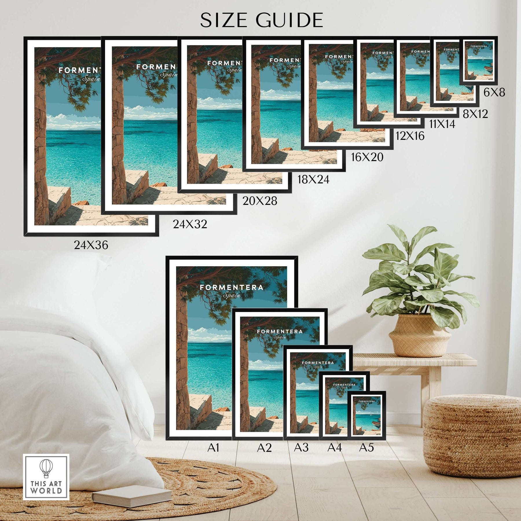Formentera Balearic Island Seascape Print | Tranquil Coastal Decor size guide displaying various frame sizes.