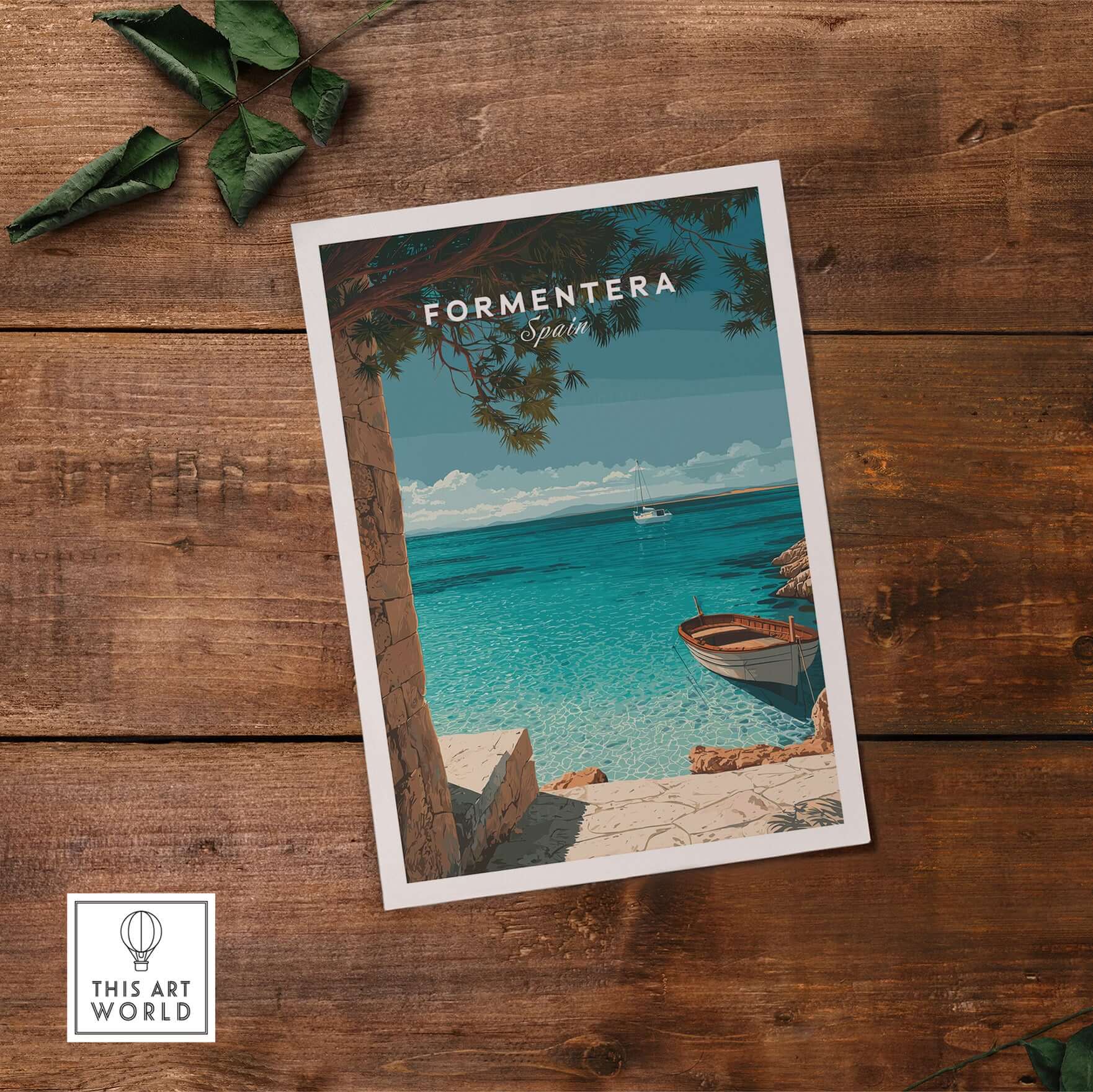 Formentera Balearic Island Seascape Print | Tranquil Coastal Decor featuring a serene boat on turquoise water.