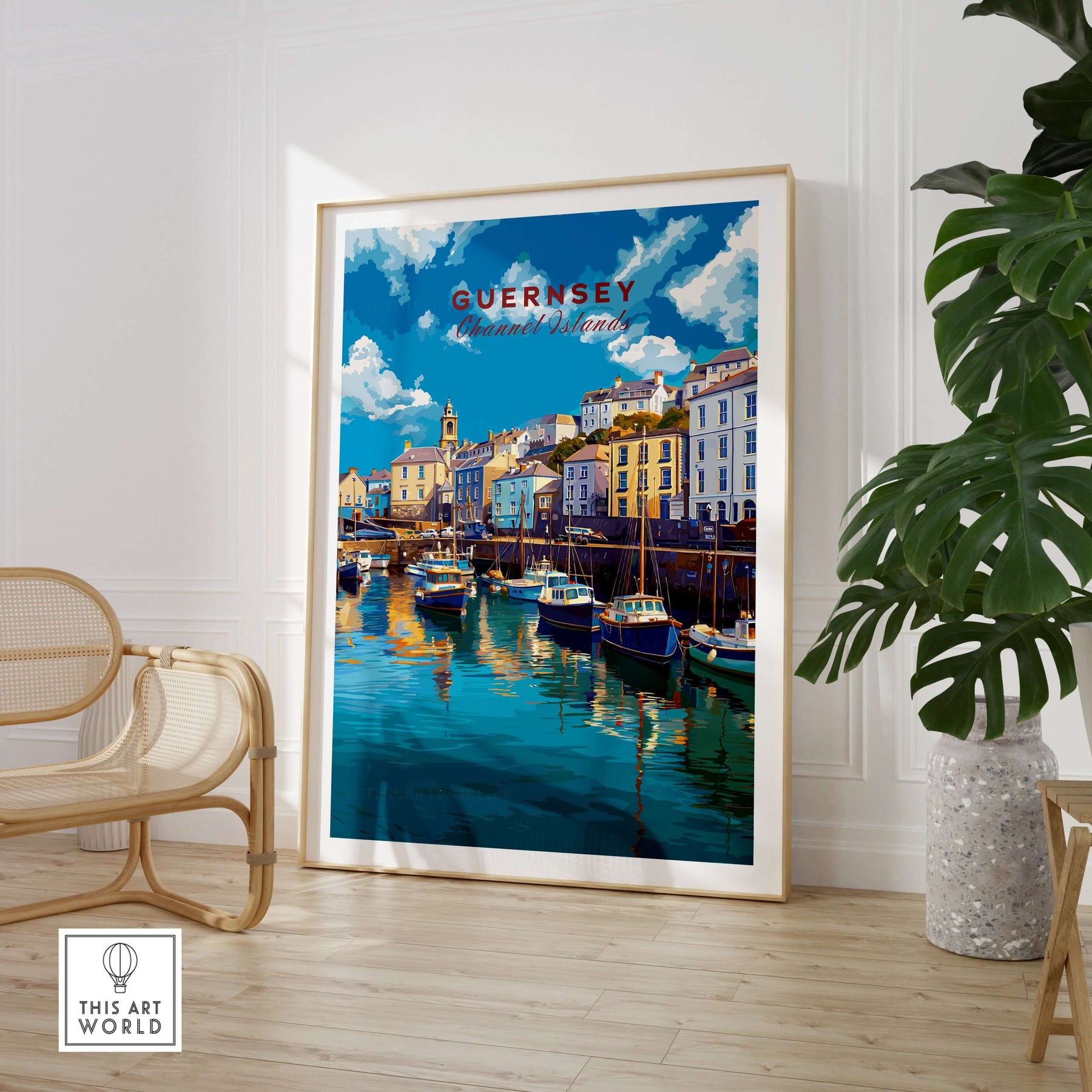 Guernsey Colourful Seaside Village Print | Channel Islands Wall Decor showcasing vibrant coastal village scene in a stylish interior.