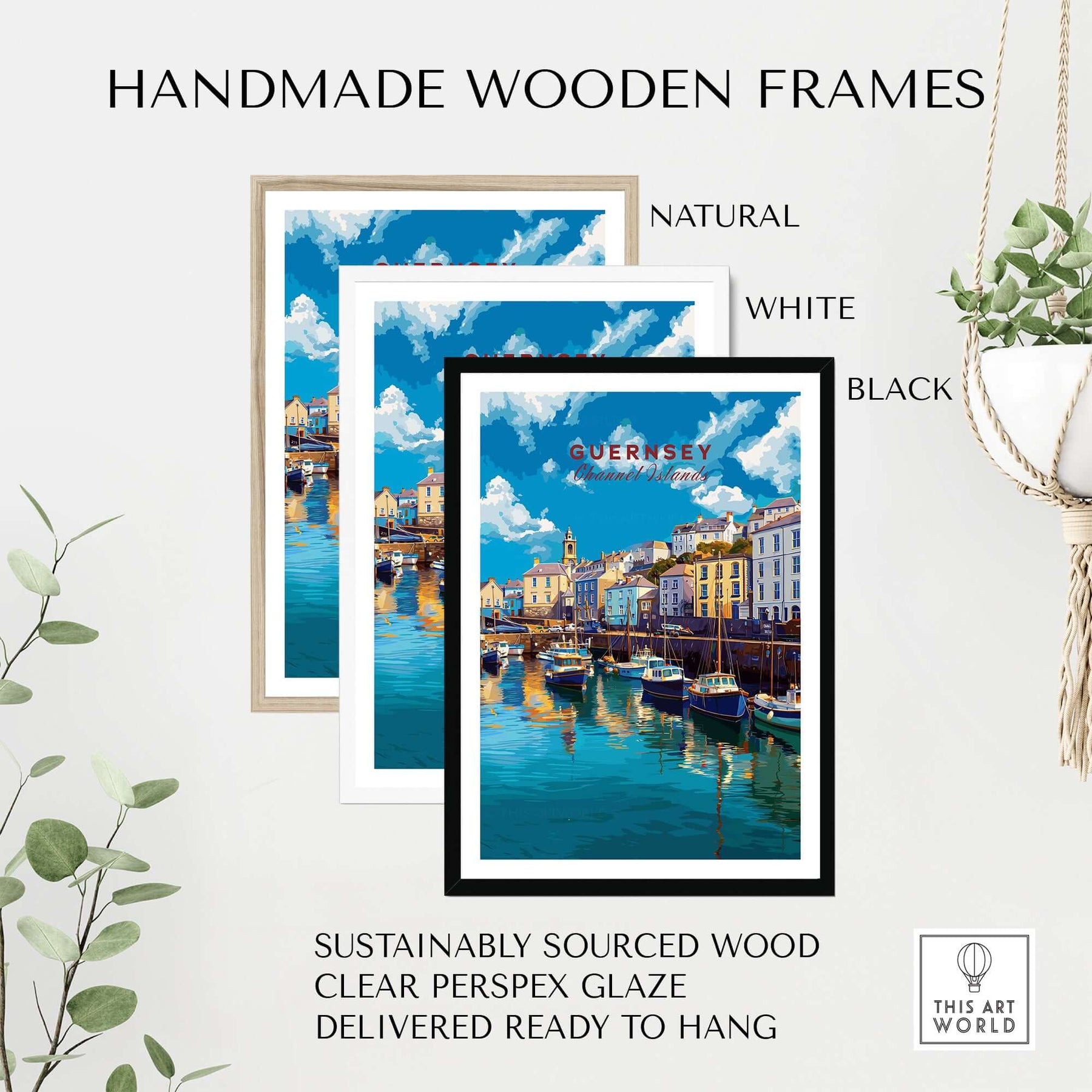 Guernsey Colourful Seaside Village Print | Channel Islands Wall Decor in handmade wooden frames, natural, white, and black.