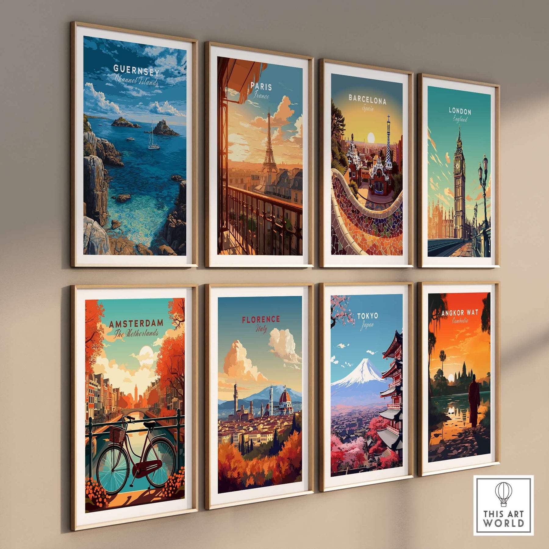 Guernsey Print | Channel Islands Wall Decor showcasing a collection of stunning travel posters on a wall.