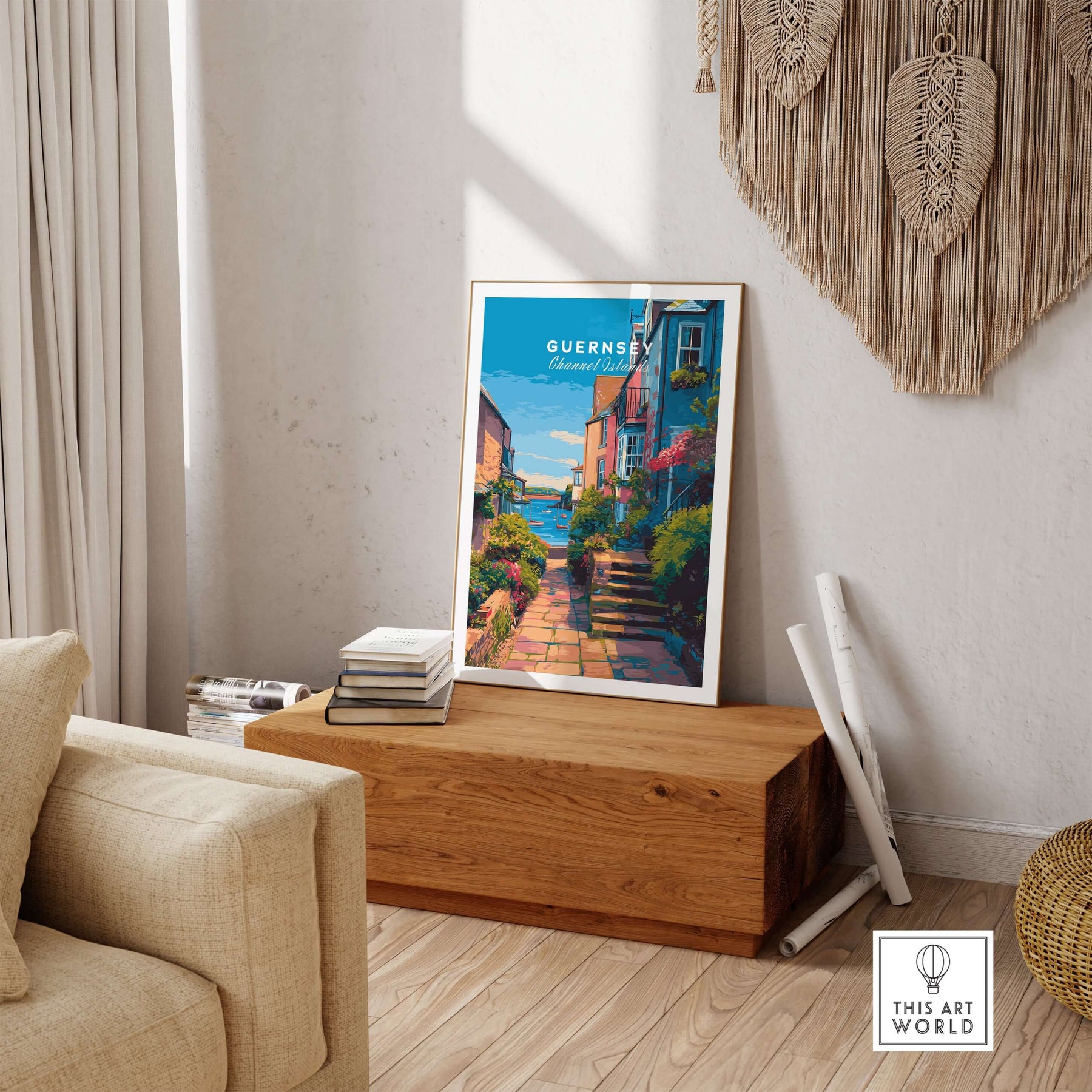 Guernsey St Peter Port Steps Print | British Seaside Wall Decor displayed in a stylish living room setting.