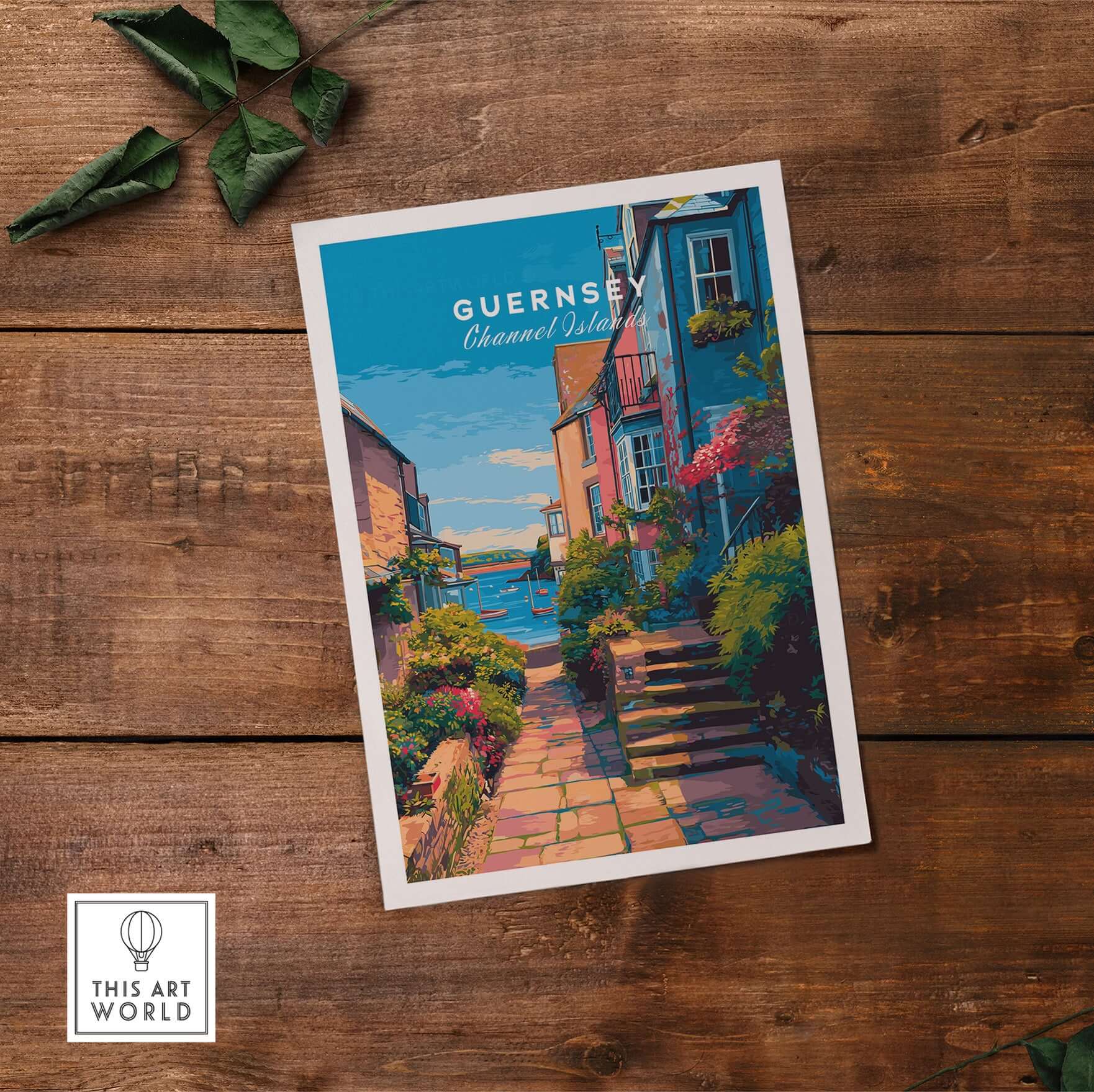 Guernsey St Peter Port Steps Print | British Seaside Wall Decor with coastal scenery and colorful houses.