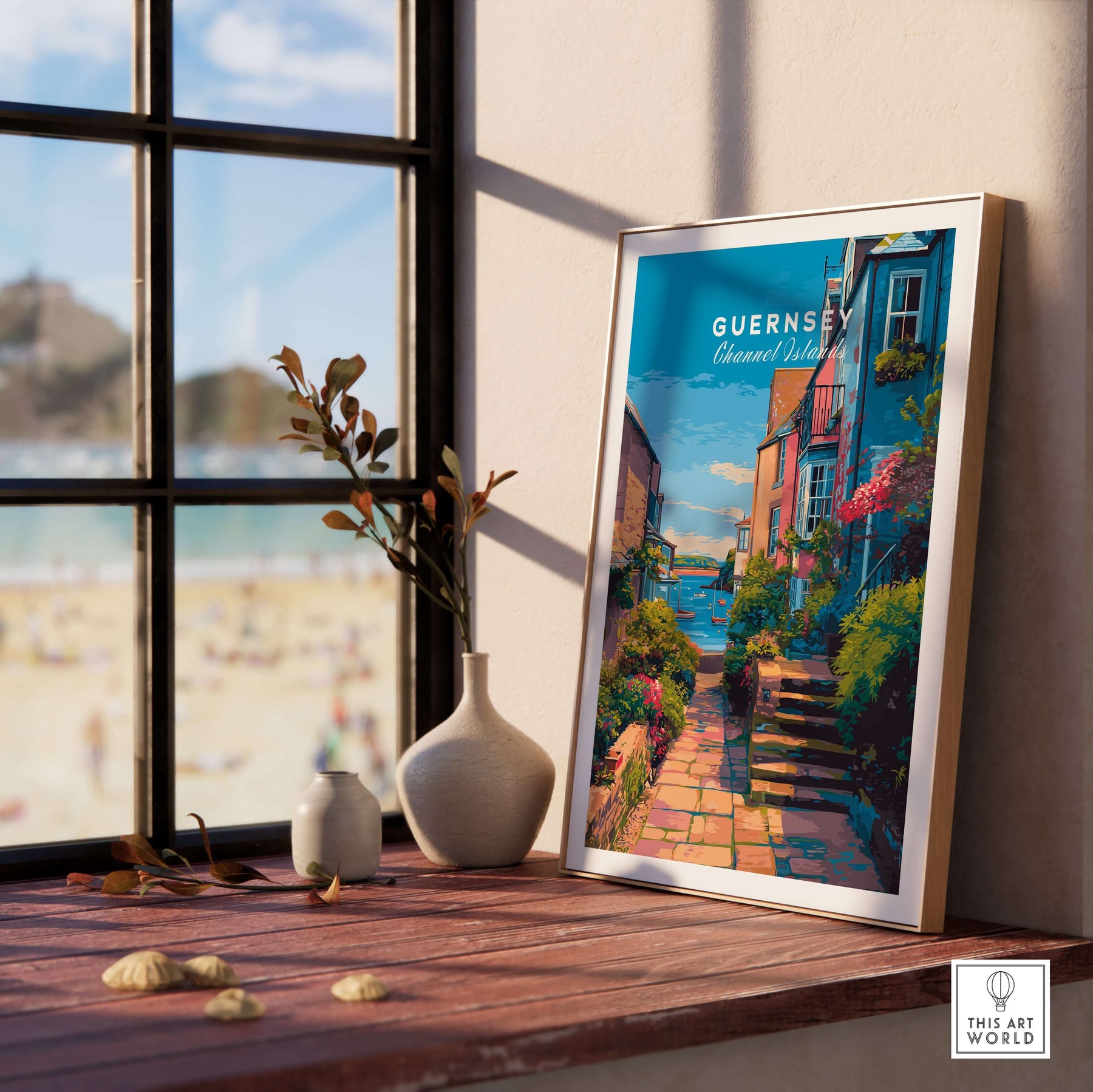 Guernsey St Peter Port Steps Print | British Seaside Wall Decor framed and displayed on a table near a sunny window.