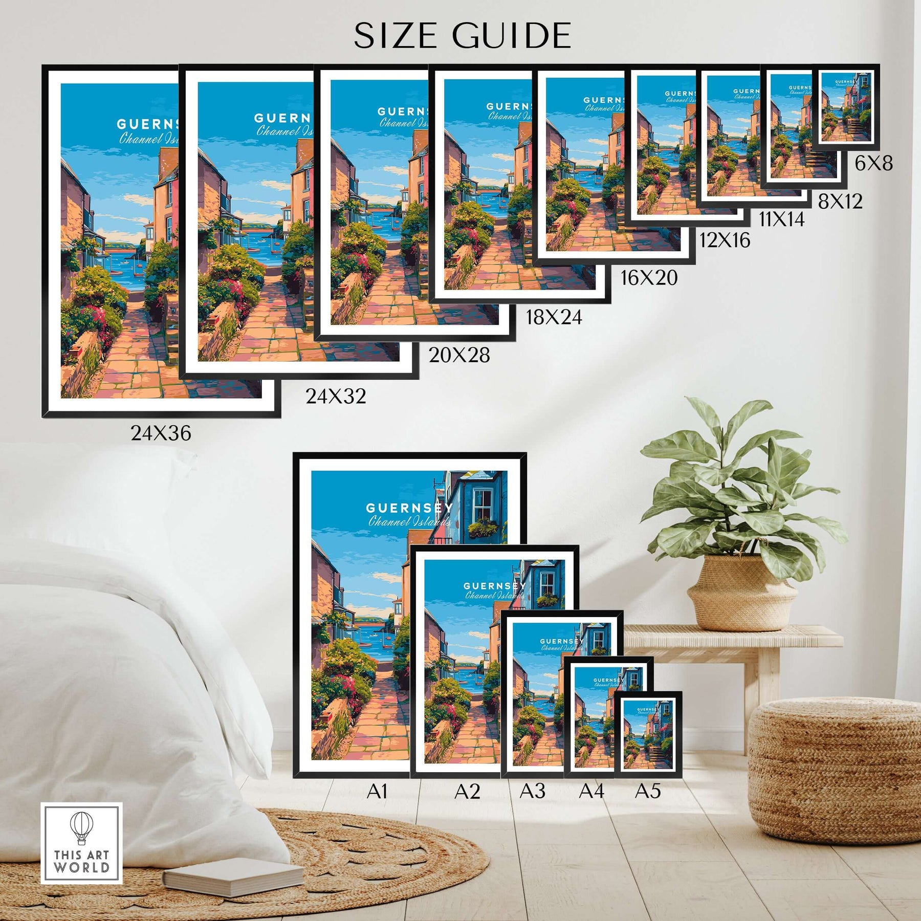 Guernsey St Peter Port Steps Print | British Seaside Wall Decor size guide showing various frame sizes