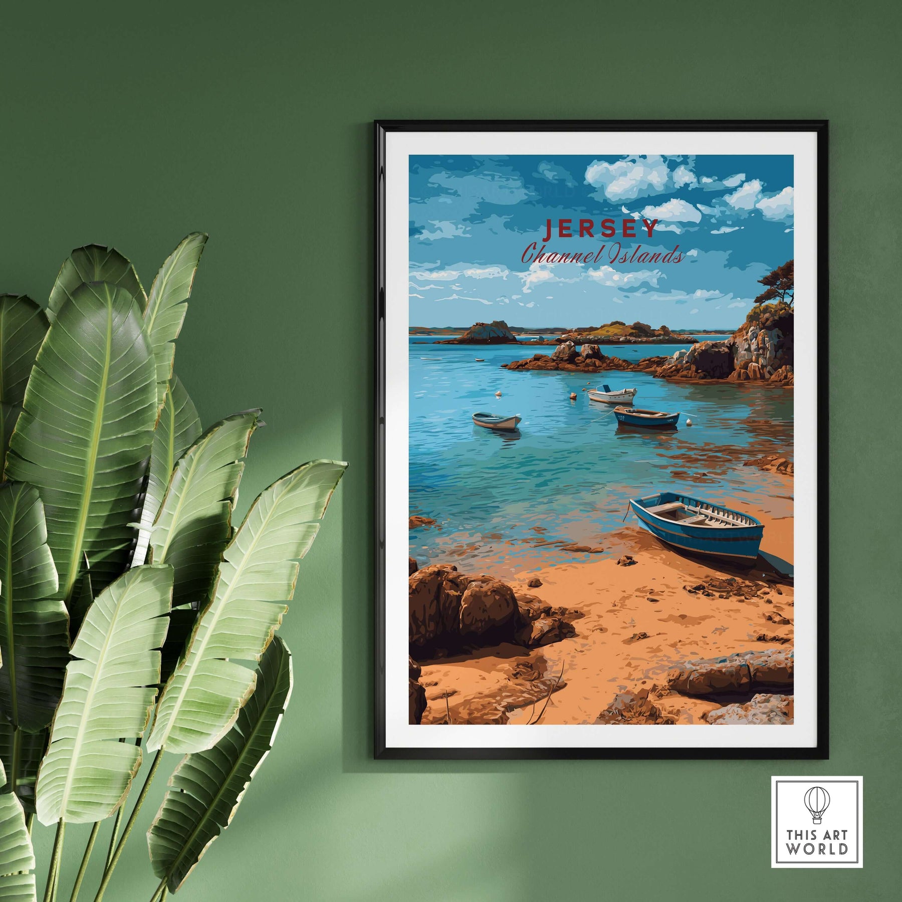 Jersey Channel Islands  Art Print | Scenic Coastal Bay Poster displayed in a cozy living room with framed art.