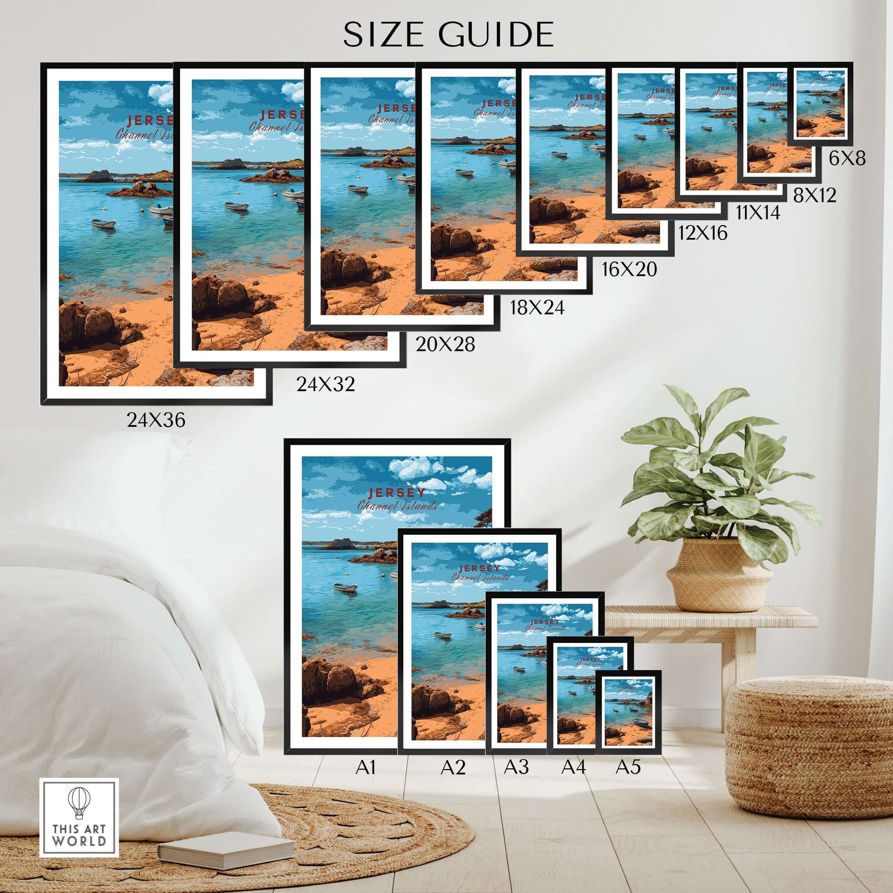 Jersey Channel Islands Art Print | Scenic Coastal Bay Poster size guide showcasing various frame sizes.