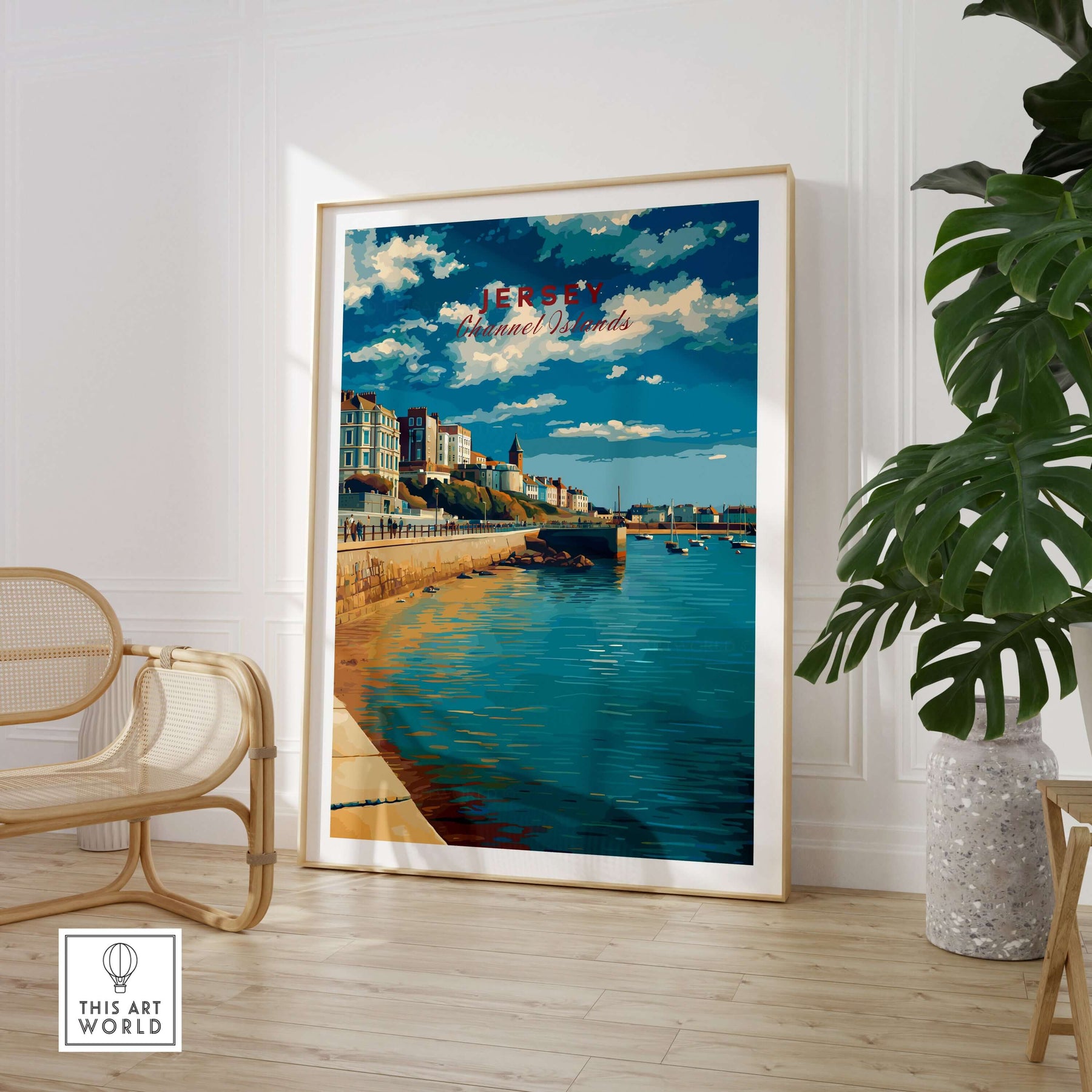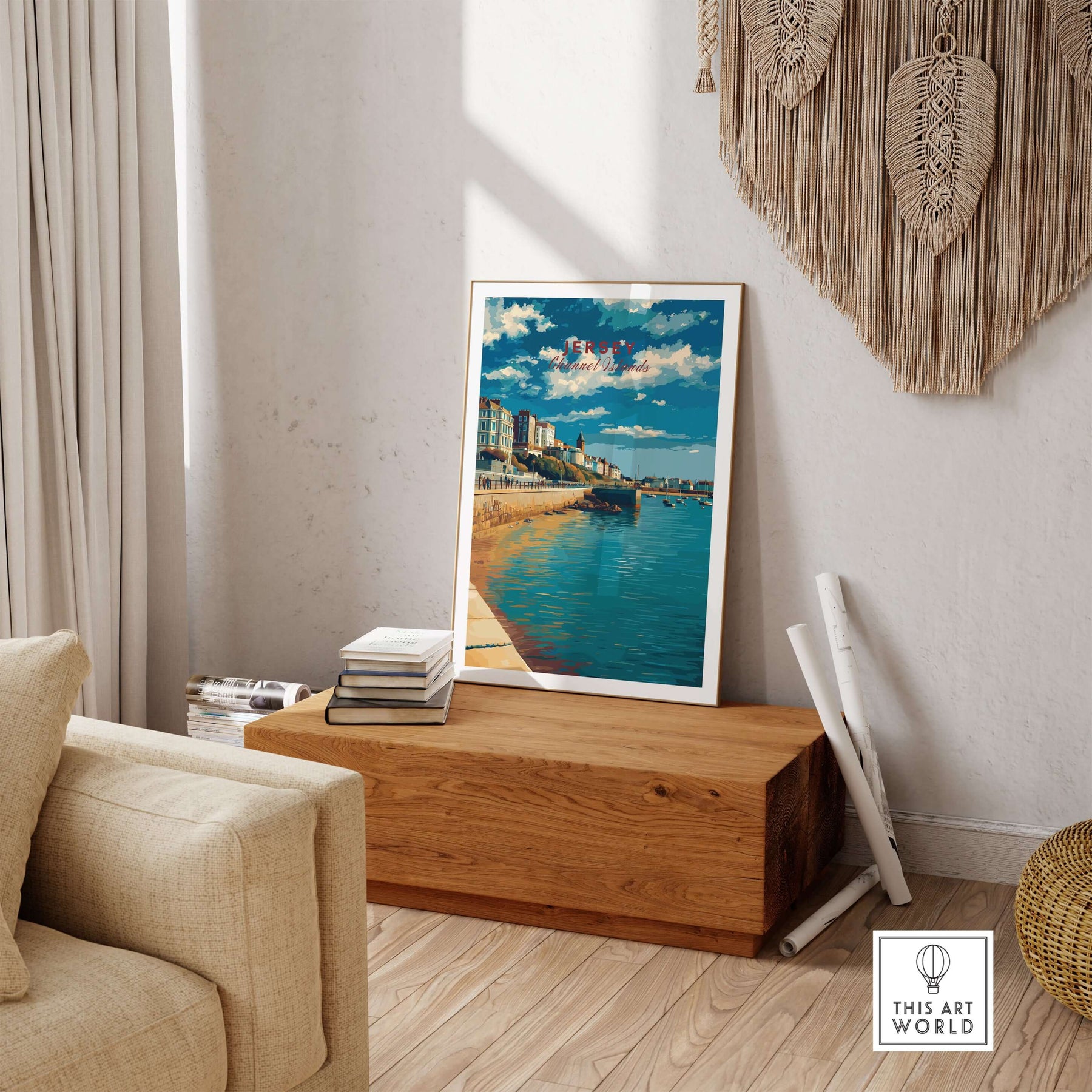 Jersey Poster -  St Helier Town Marina Print | Seaside Wall Art displayed in a stylish home setting with other travel posters.