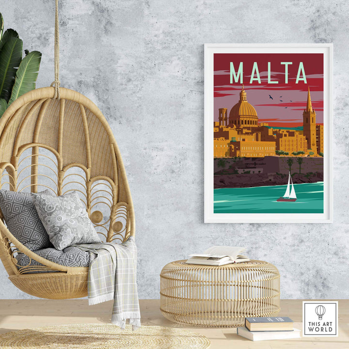 Malta poster print wall art displayed in a cozy interior with hanging chair and natural decor.