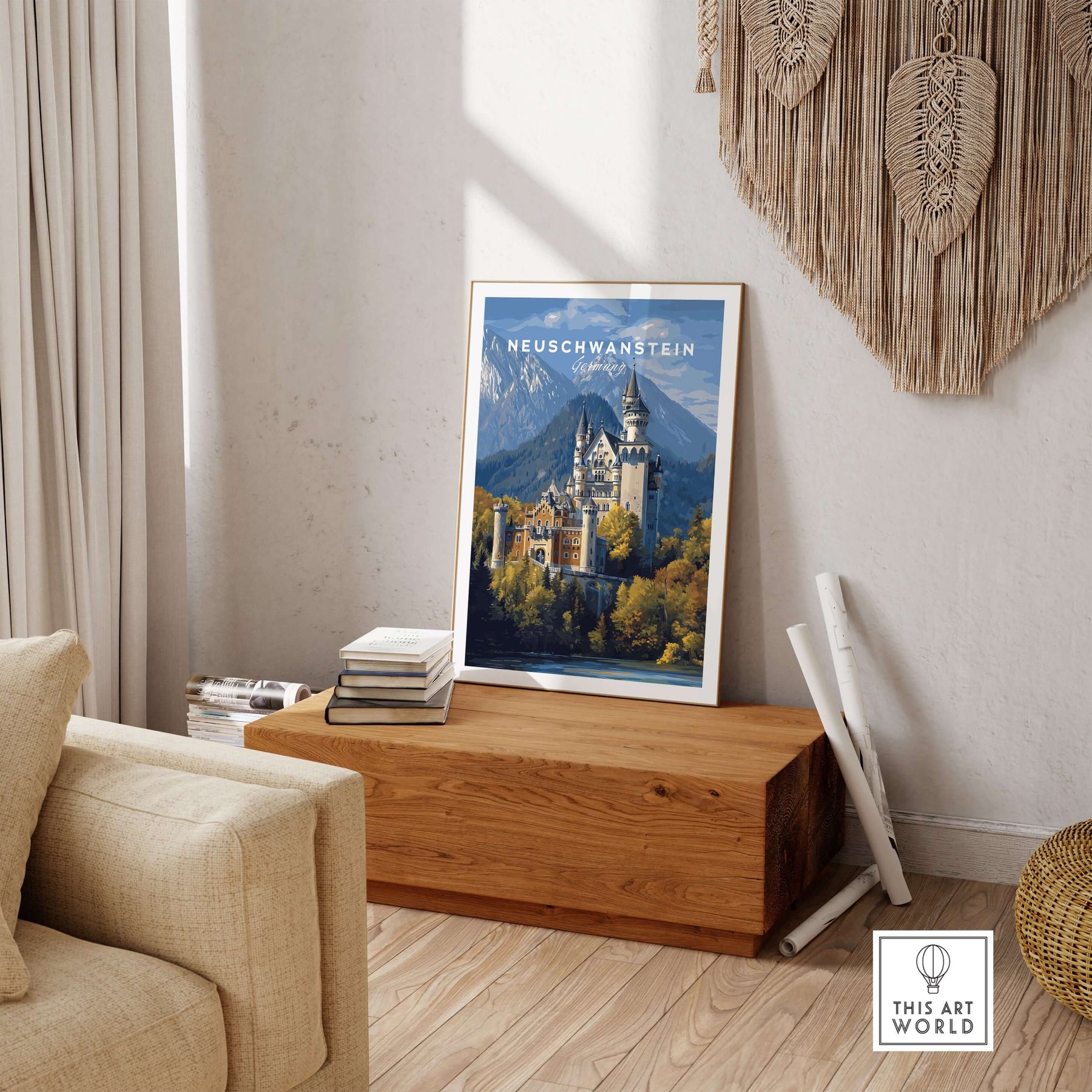 Neuschwanstein Castle Print | German Home Decor Poster displayed in a cozy living room setting.