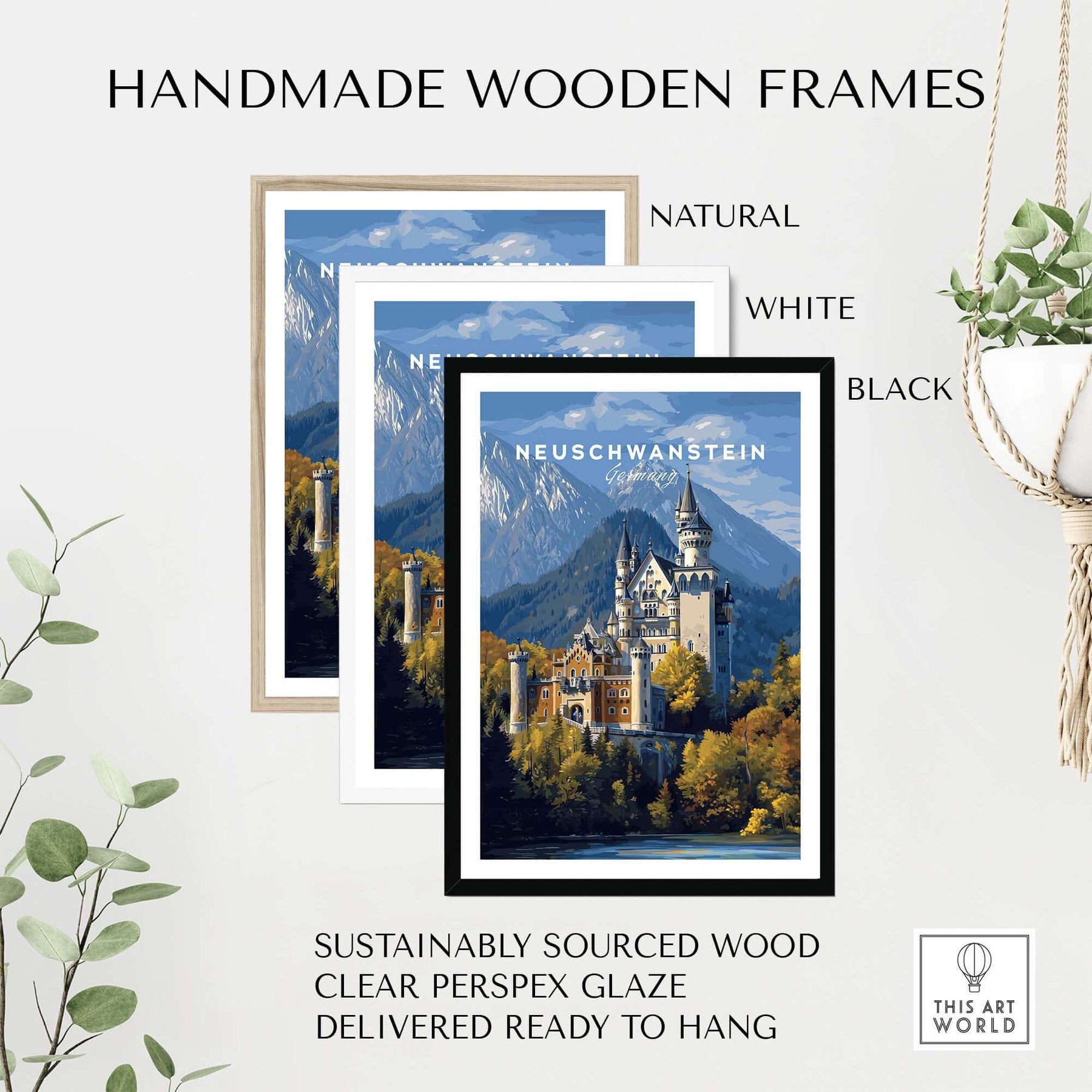 Neuschwanstein Castle Print | German Home Decor Poster displayed in handmade wooden frames in natural, white, and black.