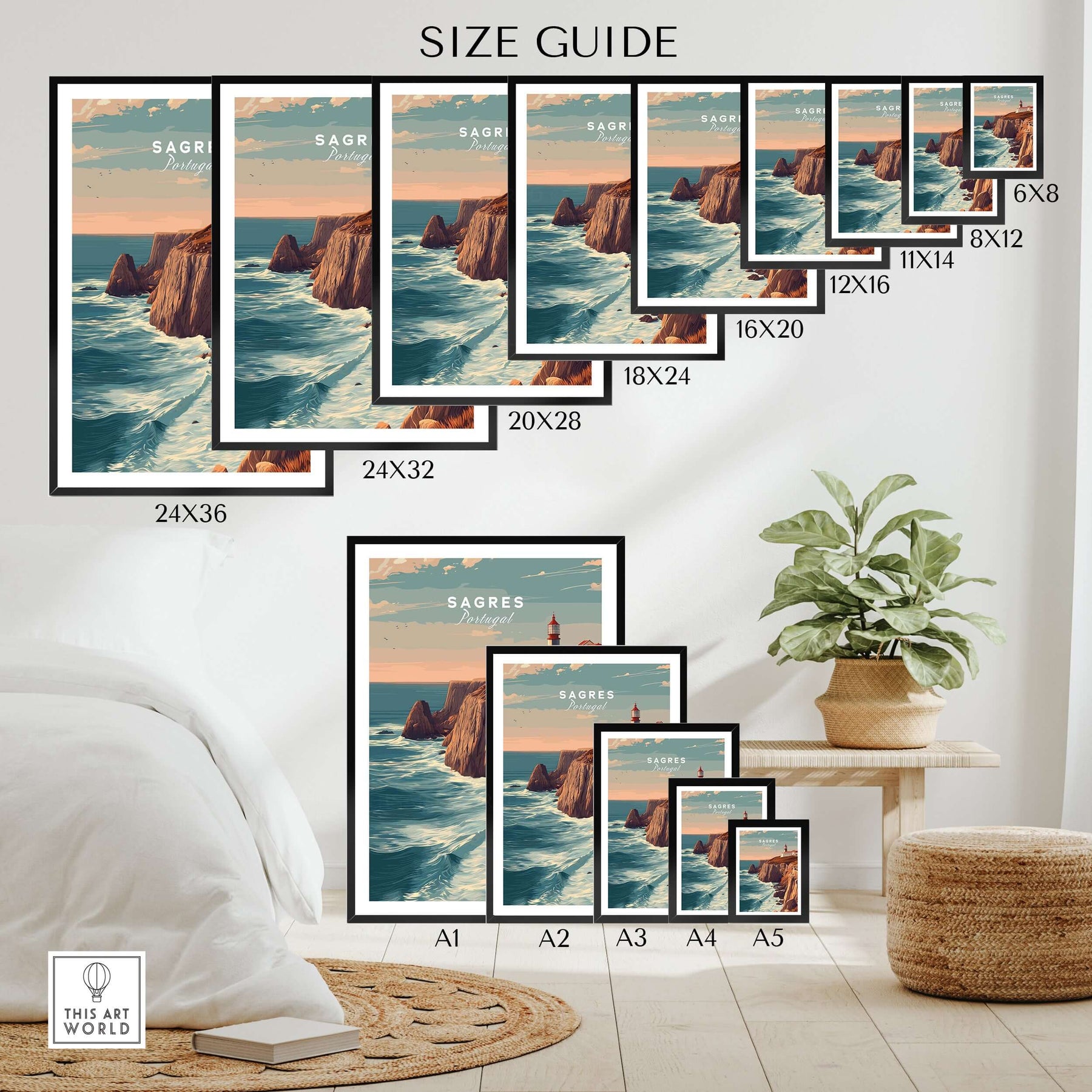 Sagres Poster - Wild Algarve Coastline View Print size guide for various frame dimensions and placement in a living space.