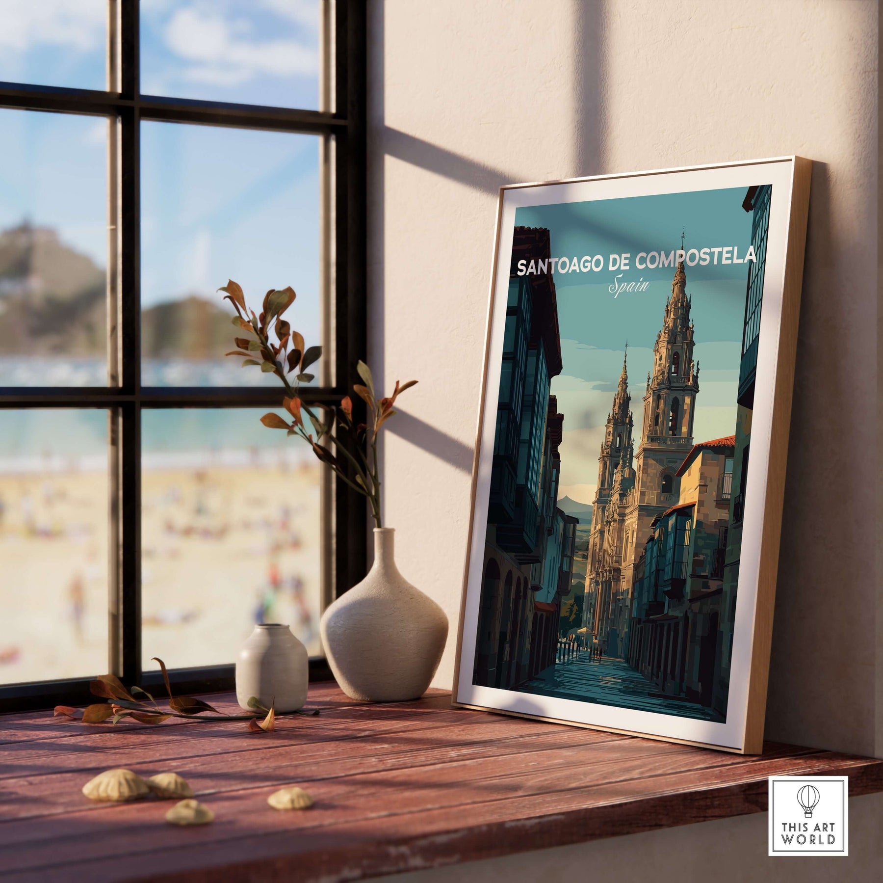 Santiago de Compostela Galician Old Town Architecture Print | Camino Wall Decor displayed in a sunny room with plants.
