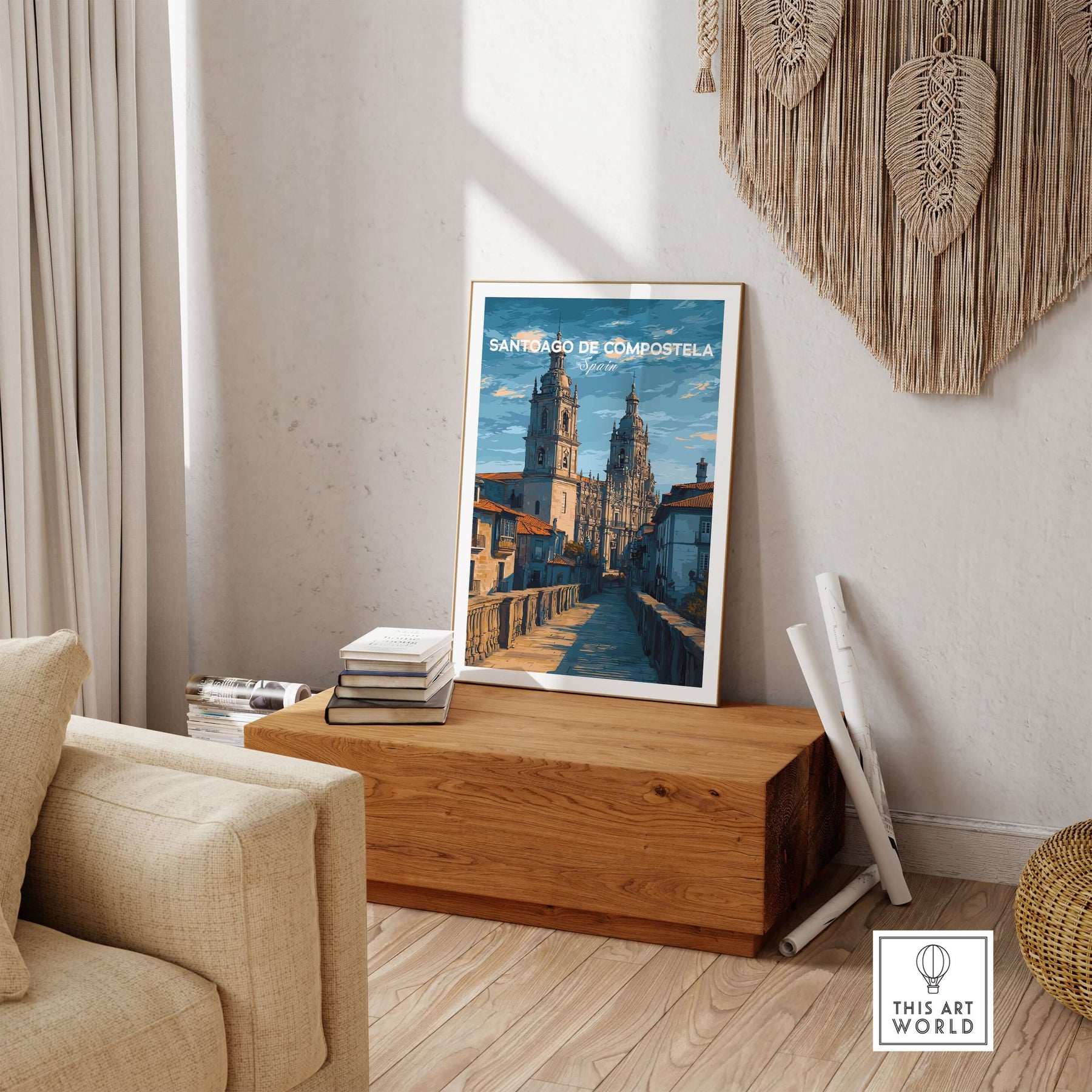 Santiago de Compostela Spain Print | Camino Wall Decor displayed in a cozy living room setting.