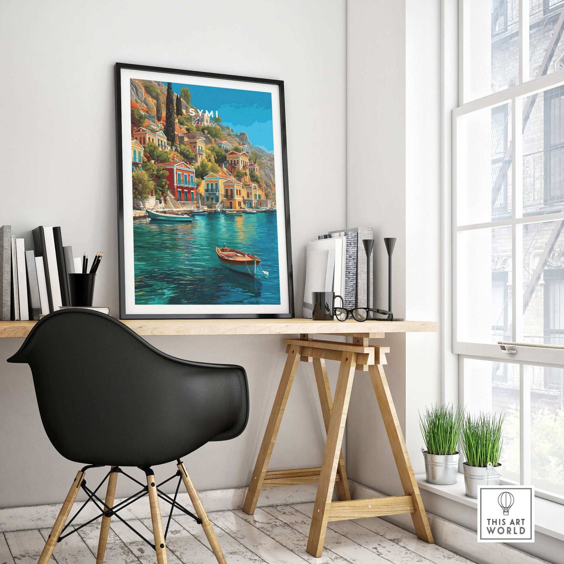Symi Poster - Aegean Island Print | Greek Travel Wall Art displayed in a cozy home office setting.