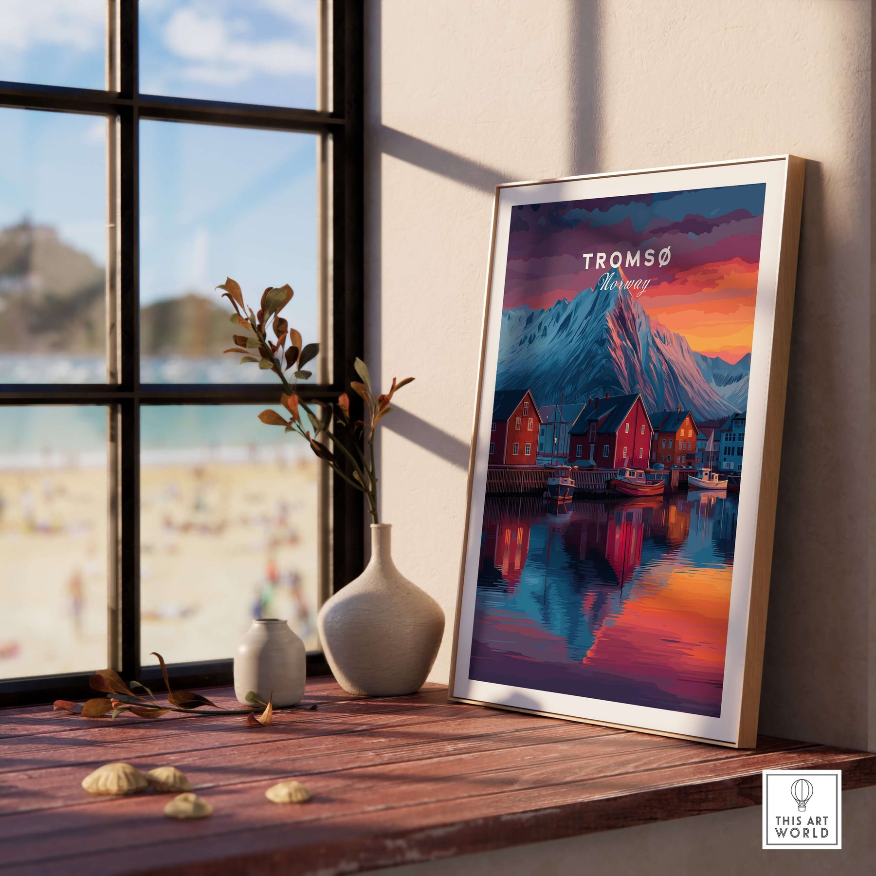 Tromsø Poster Arctic Fjord Town Print | Norwegian Wall Art displayed on a wooden table near a sunny window.