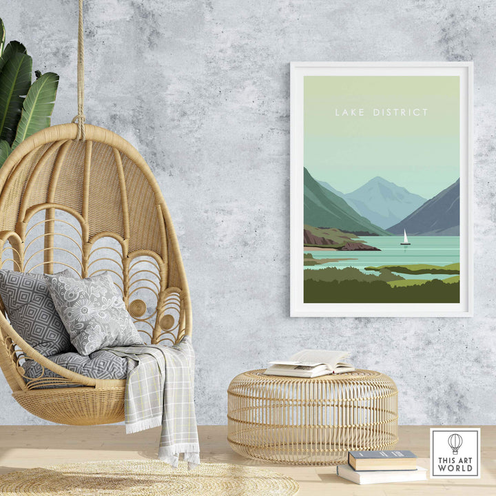 Lake District print wall art poster displayed in a cozy interior with a hanging chair and natural decor.