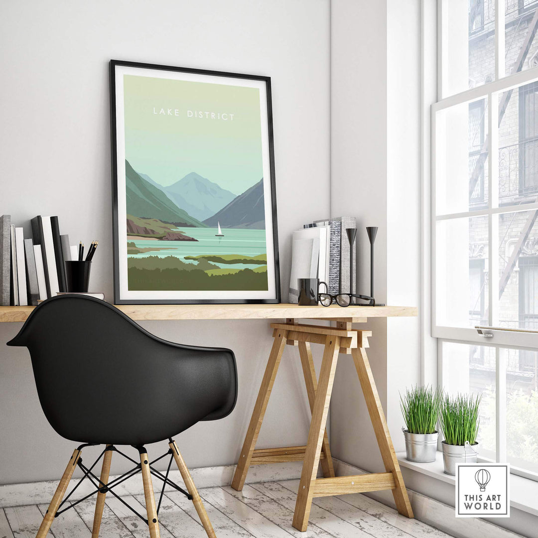 Lake District Print Wall Art Poster displayed in a modern workspace with a stylish chair and desk.