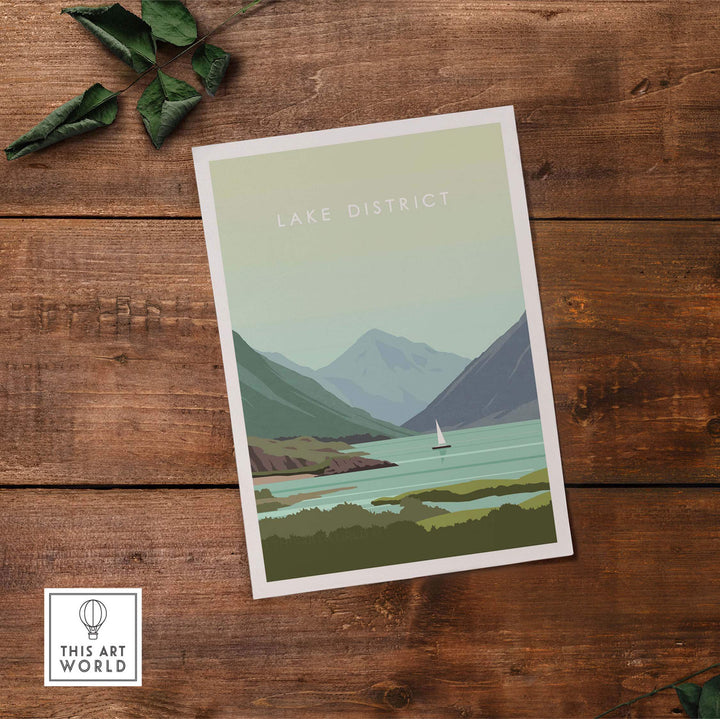 Lake District Print Wall Art Poster featuring serene mountains and a sailboat on tranquil waters.