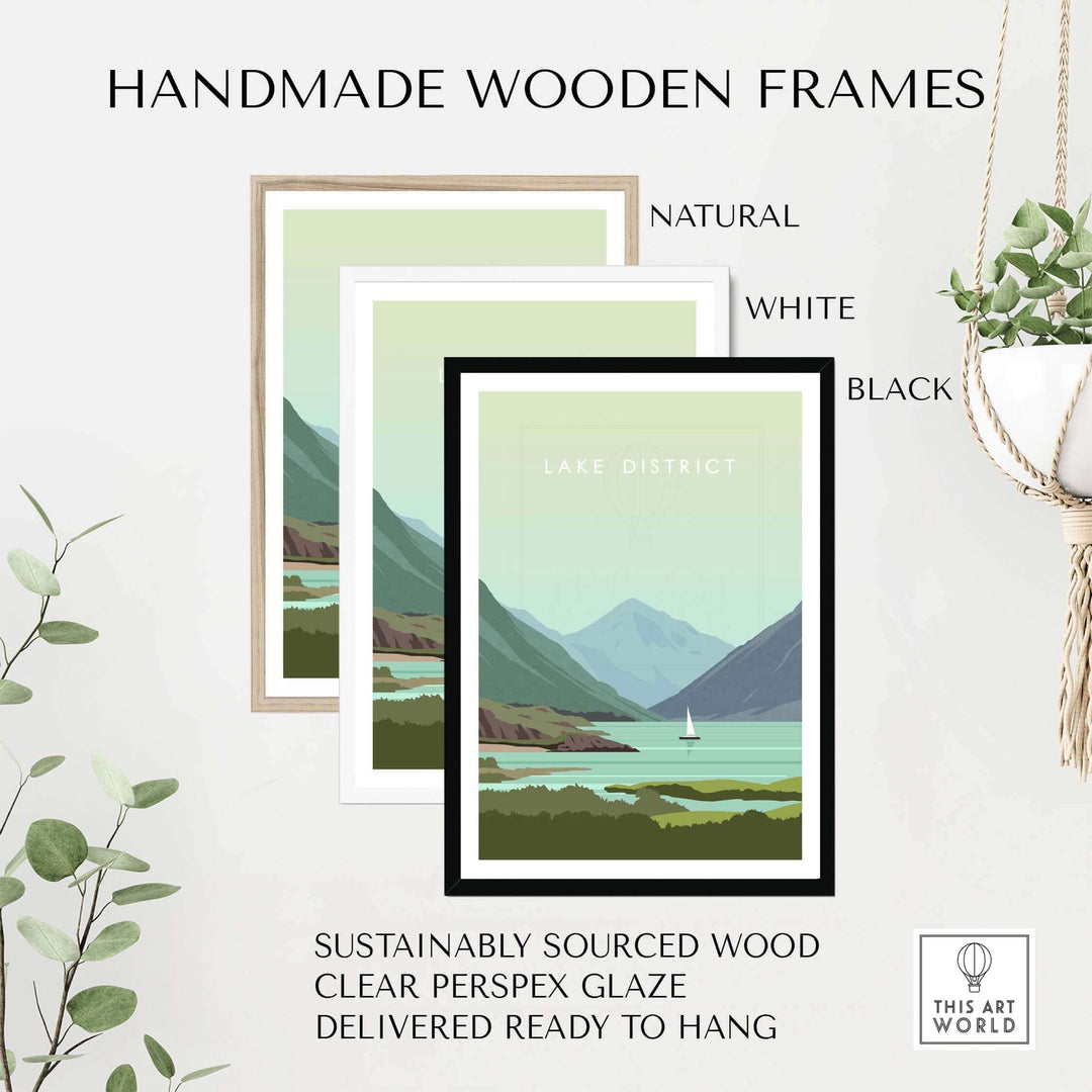 Handmade wooden frames for Lake District print wall art in natural, white, and black finishes, ready to hang.