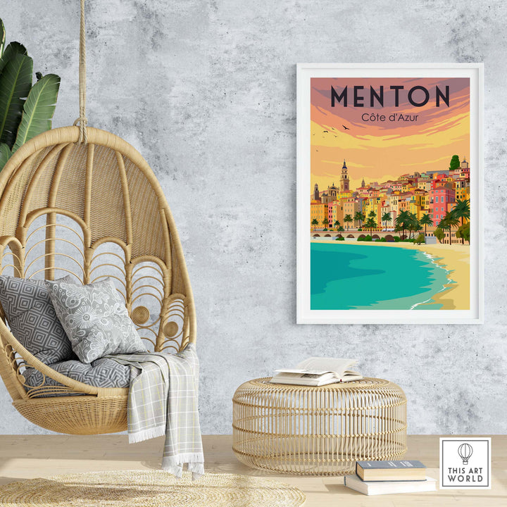 Menton France vintage poster art in stylish home decor setting with hanging chair and decorative elements.