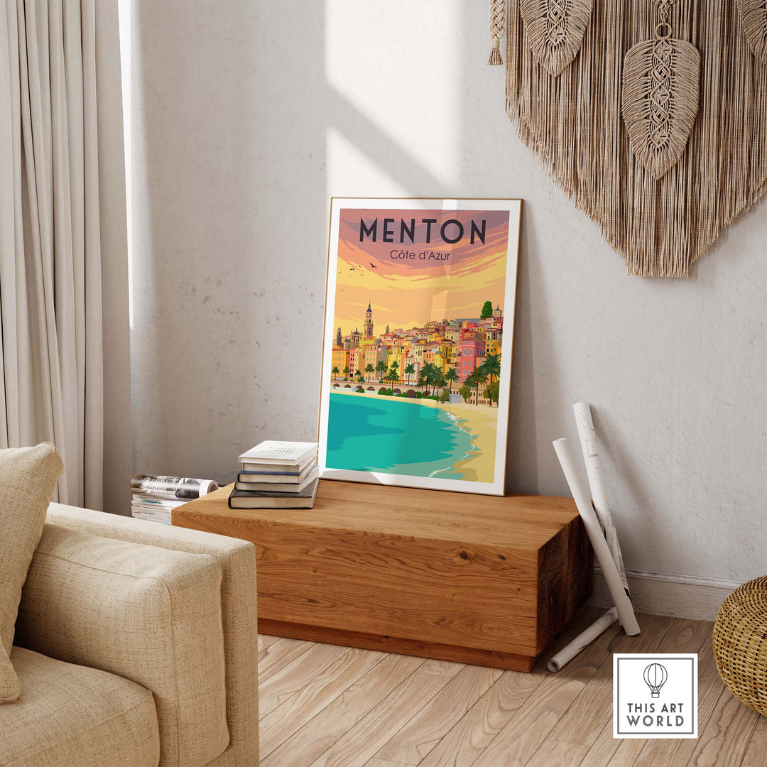 Vintage Menton France print poster displayed in a stylish home setting, evoking wanderlust and travel vibes.
