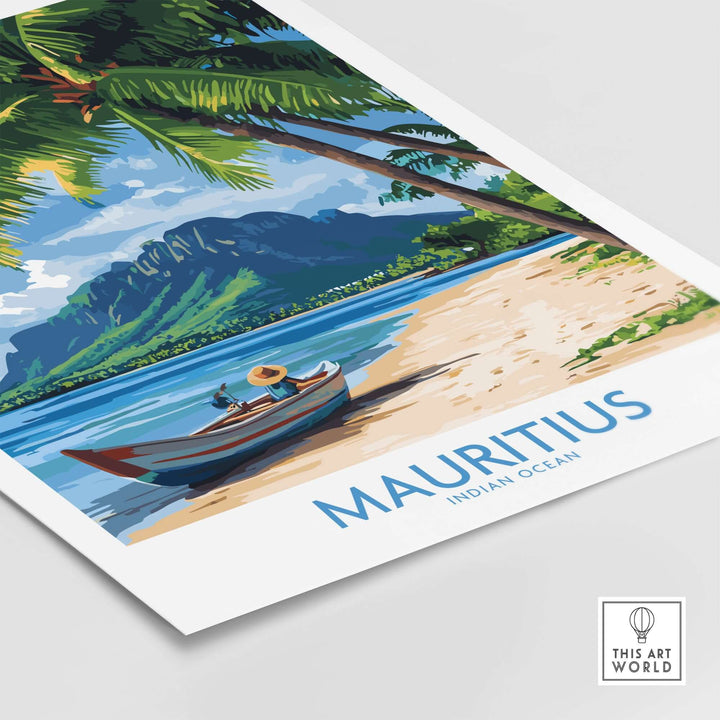 Mauritius beach poster featuring a boat, palm trees, and stunning landscape, perfect for travel enthusiasts.