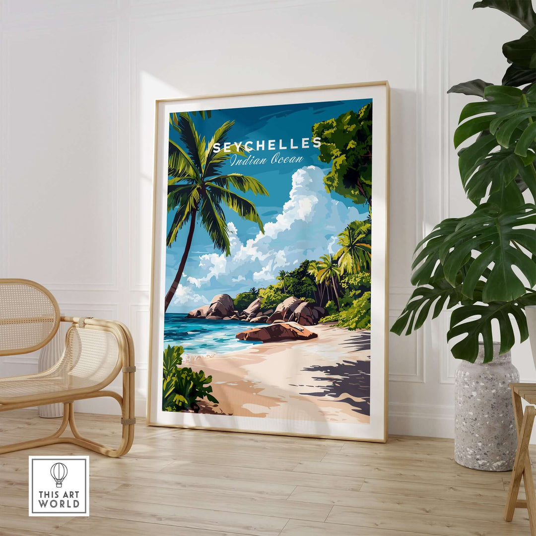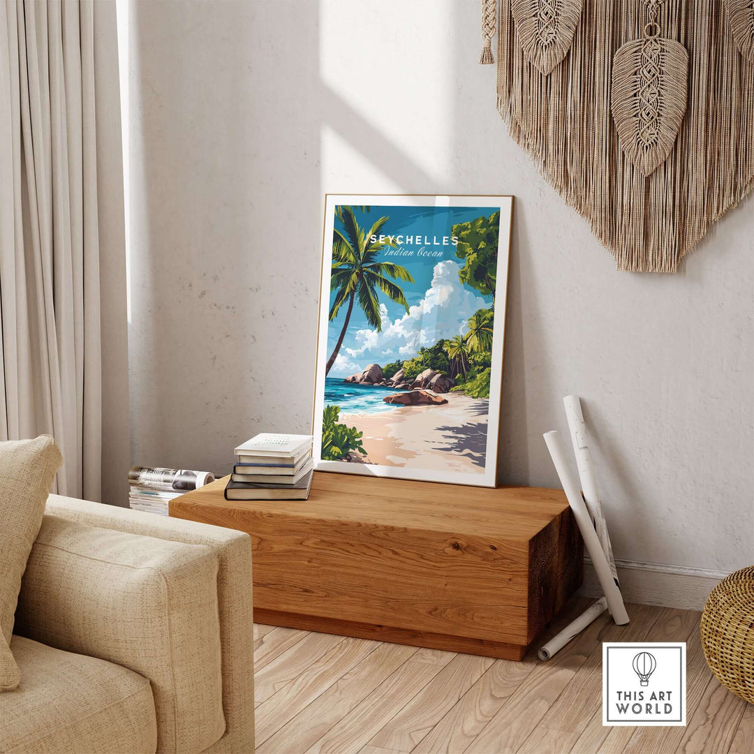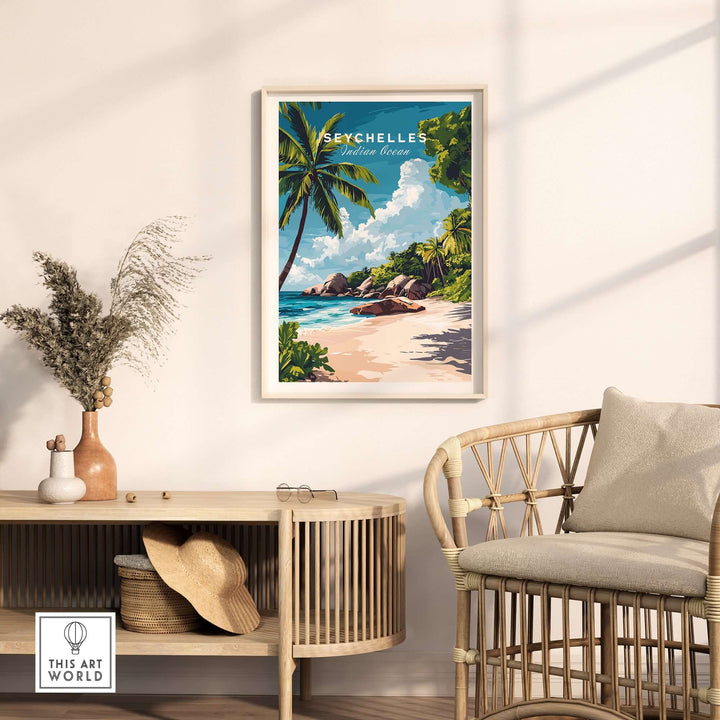 Beach Paradise Art featuring Seychelles wall poster with vibrant colors in a cozy room setting by the window.