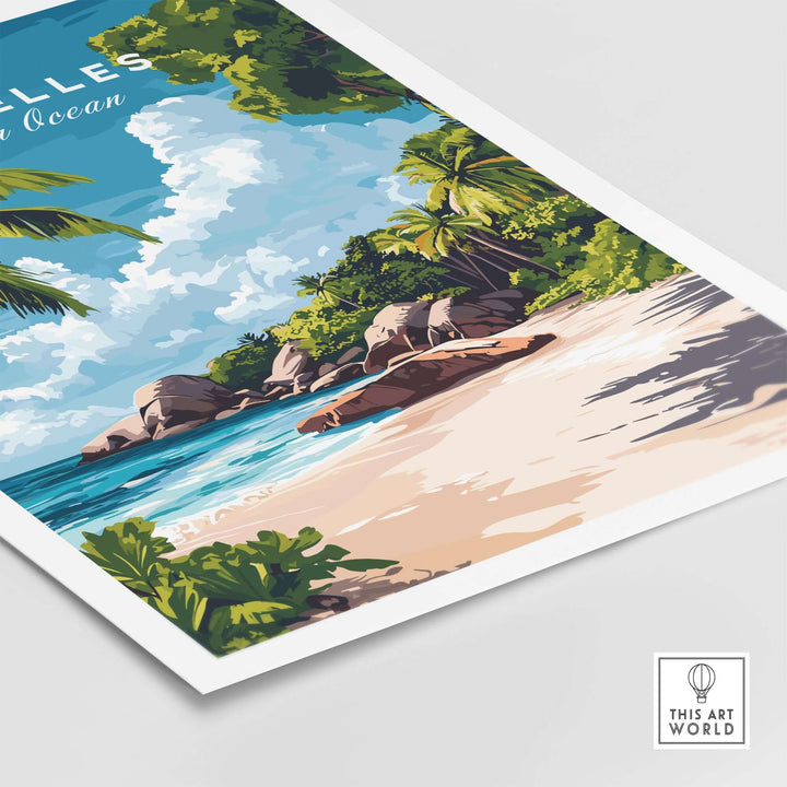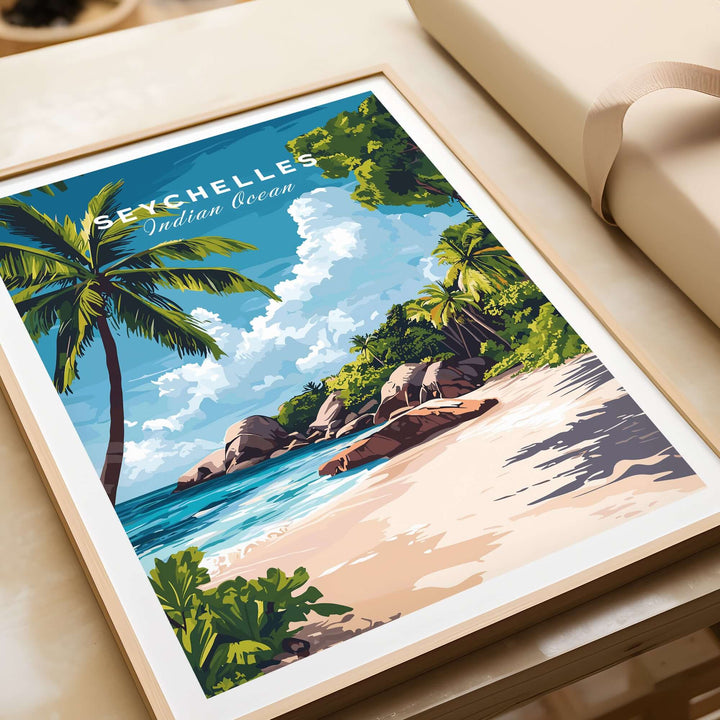 Seychelles wall poster featuring a tropical beach scene, adding a serene vibe to home decor.
