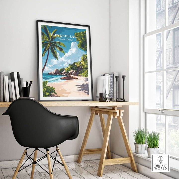 Seychelles wall poster showcased in a stylish workspace, featuring vibrant beach scene and tropical greenery.
