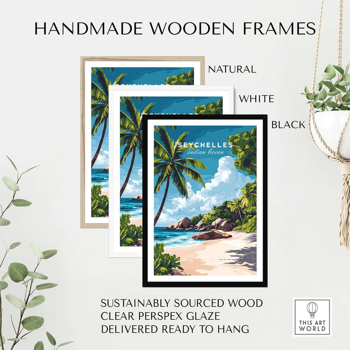 Handmade wooden frames in natural, white, and black for Seychelles Beach Paradise Art poster, ready to hang.