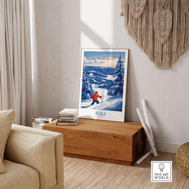 Finland Ski Adventure Poster featuring a skier in a snowy Ruka landscape, displayed indoors with a scenic view.