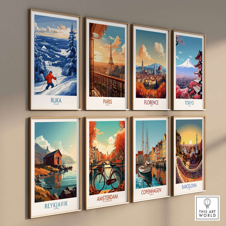 Finland Ski Adventure poster alongside iconic city prints like Paris and Tokyo, featuring vibrant Scandinavian wall art.