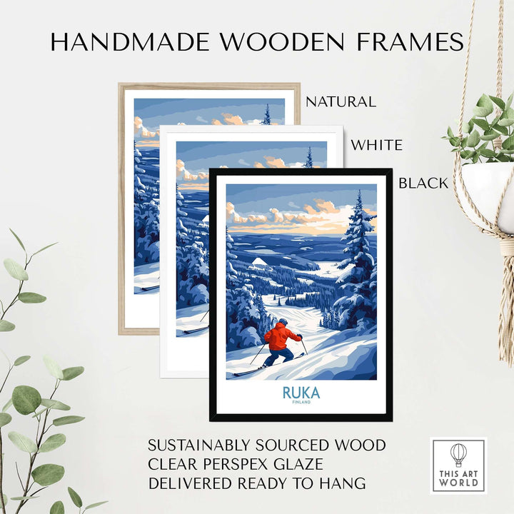 Three handmade wooden frames in natural, white, and black styles displaying a Ruka ski adventure poster.