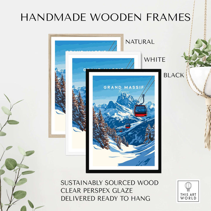 Three handmade wooden frames in natural, white, and black showcasing a Grand Massif ski print, sustainably sourced and ready to hang.