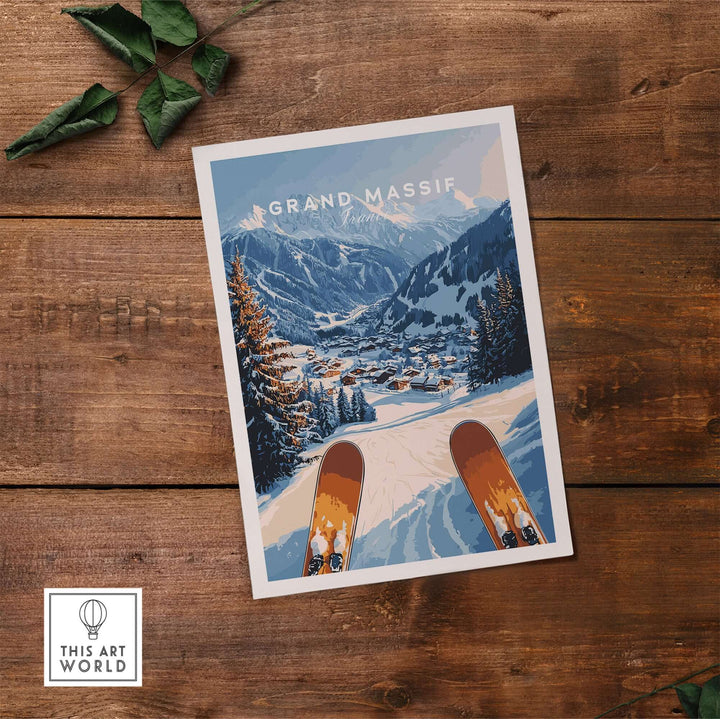 Grand Massif Ski Wall Art featuring snowy mountains and skis, ideal for skiing enthusiasts and home decor.