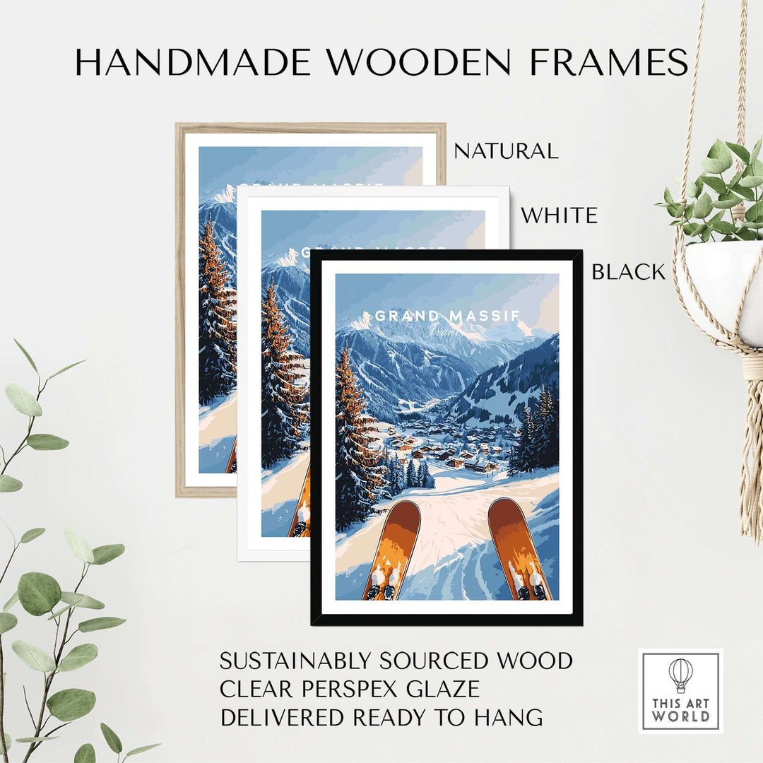 Stylish handmade wooden frames in natural, white, and black for Grand Massif Ski Wall Art, ready to hang.