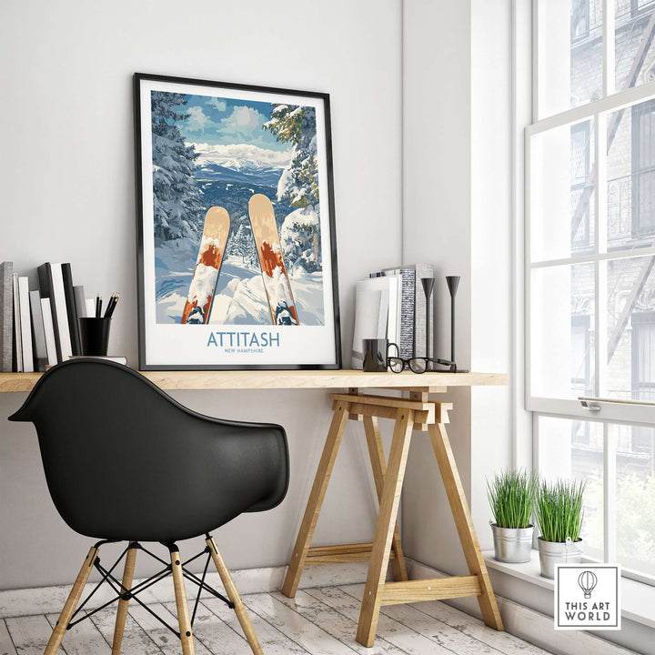 Ski poster of Attitash, New Hampshire, displayed in a stylish home office setting with skis and snow-covered mountains.