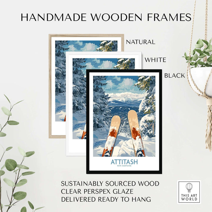 Handmade wooden frames in natural, white, and black for Attitash ski poster, made with sustainably sourced wood.