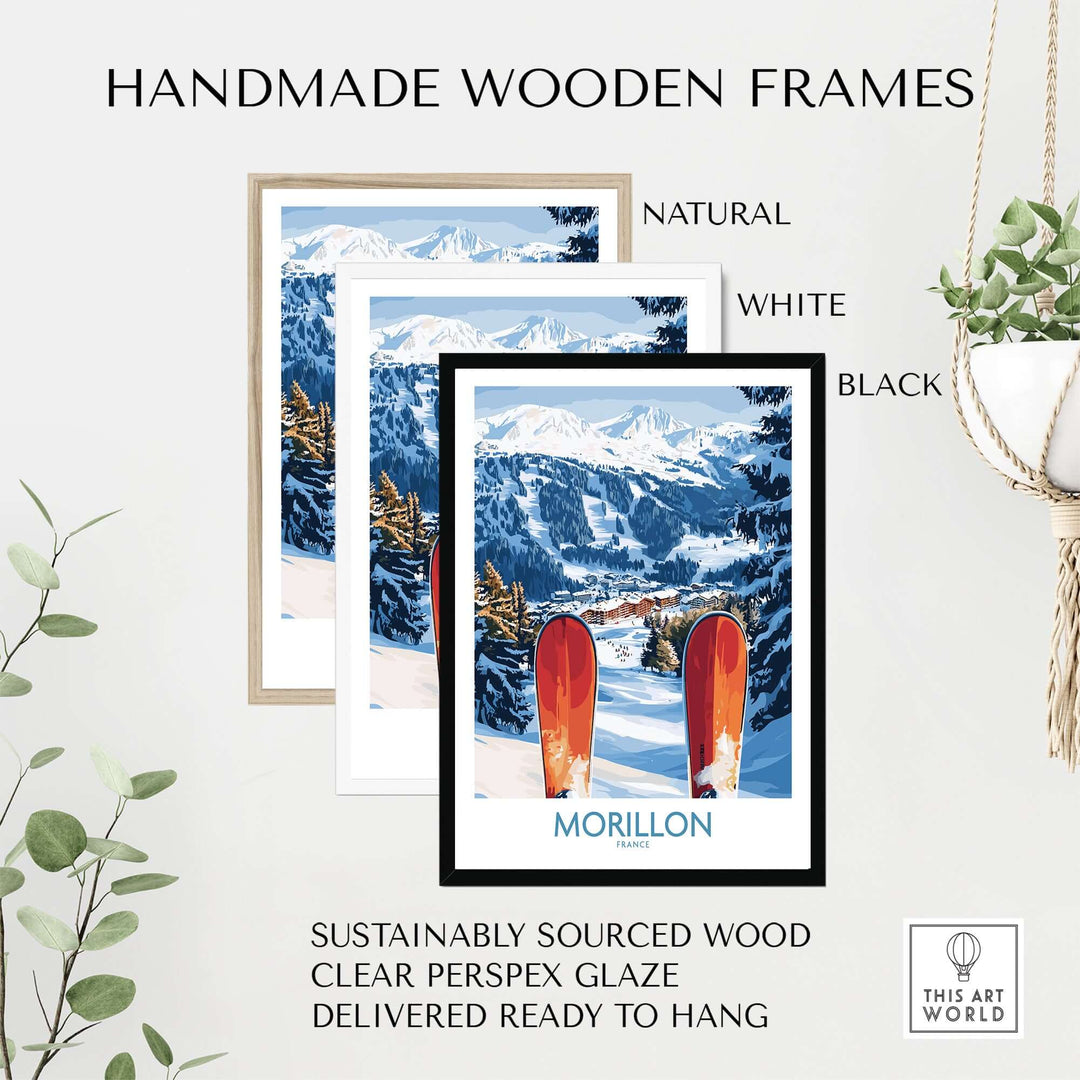 Handmade wooden frames for Ski Poster Morillon, France, in natural, white, and black finishes, ready to hang.
