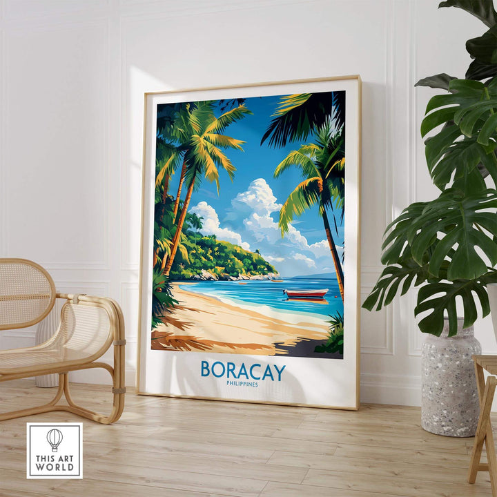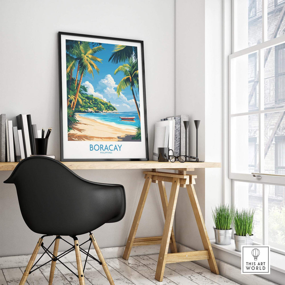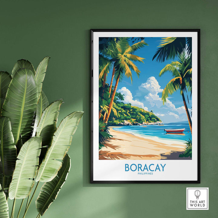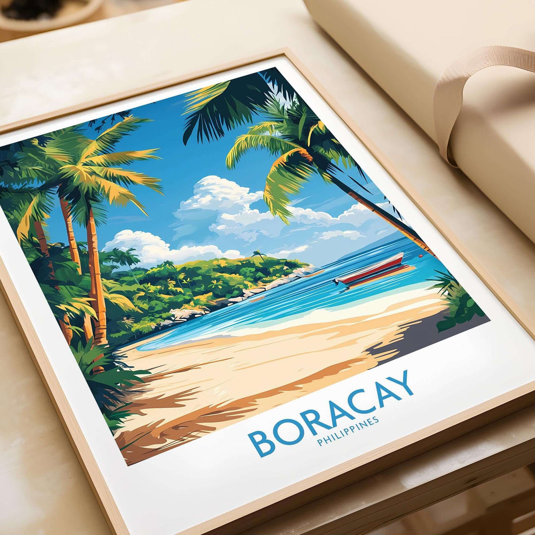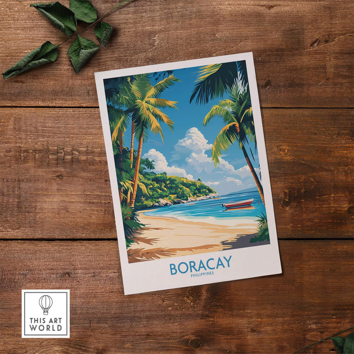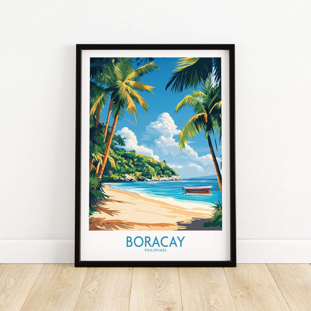 Emportez avec vous un morceau de paradis tropical avec notre affiche murale Boracay Philippines ! Cette affiche présente une vue imprenable sur la célèbre plage blanche, avec des palmiers en arrière-plan. Apportez une ambiance insulaire à votre maison avec cette affiche imprimée des Philippines.