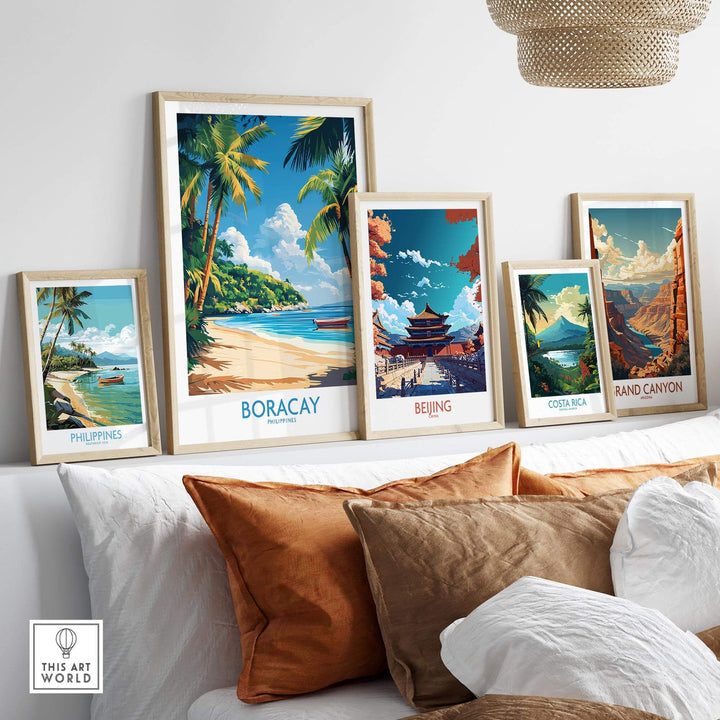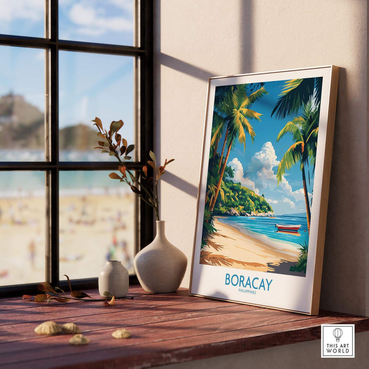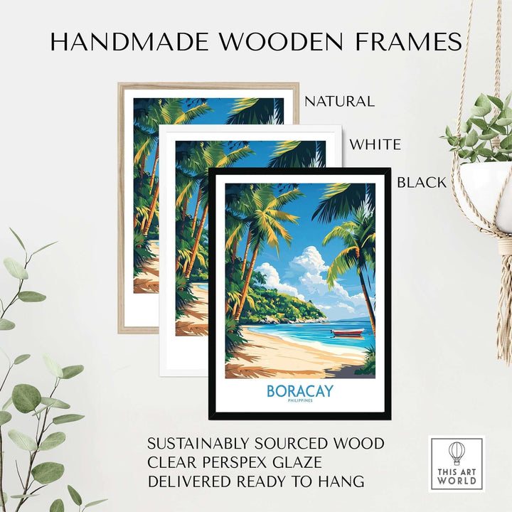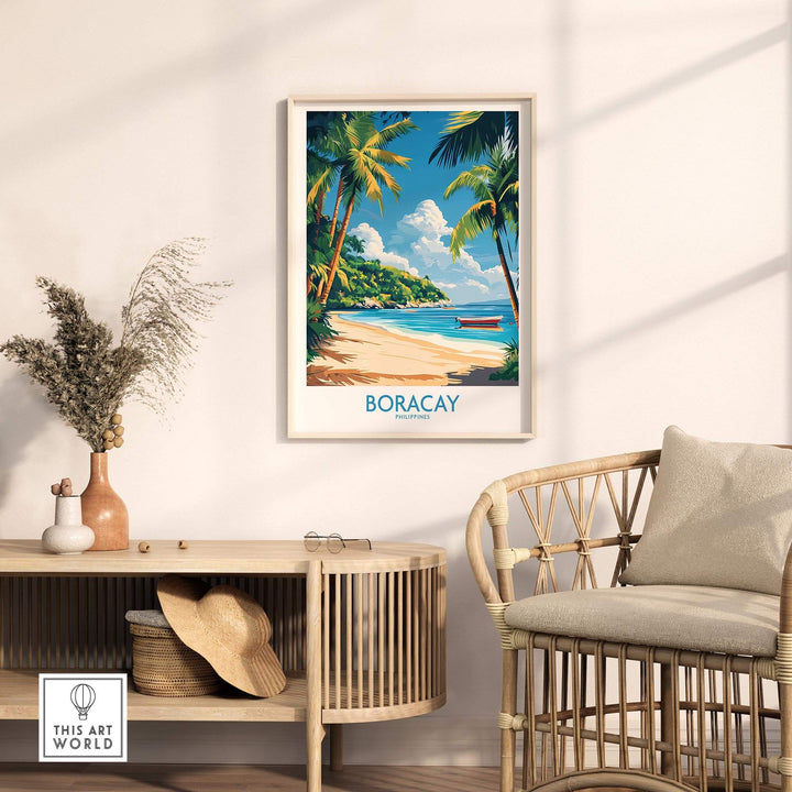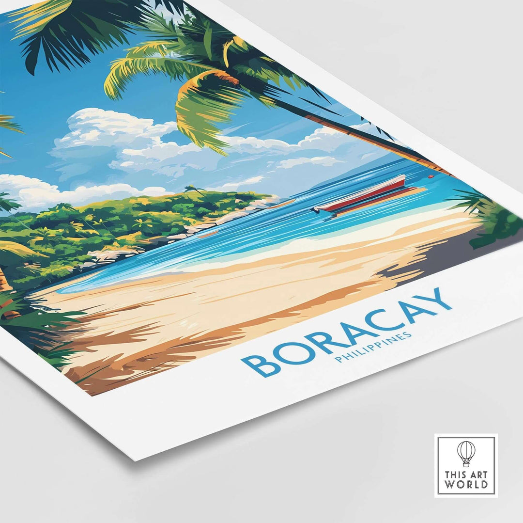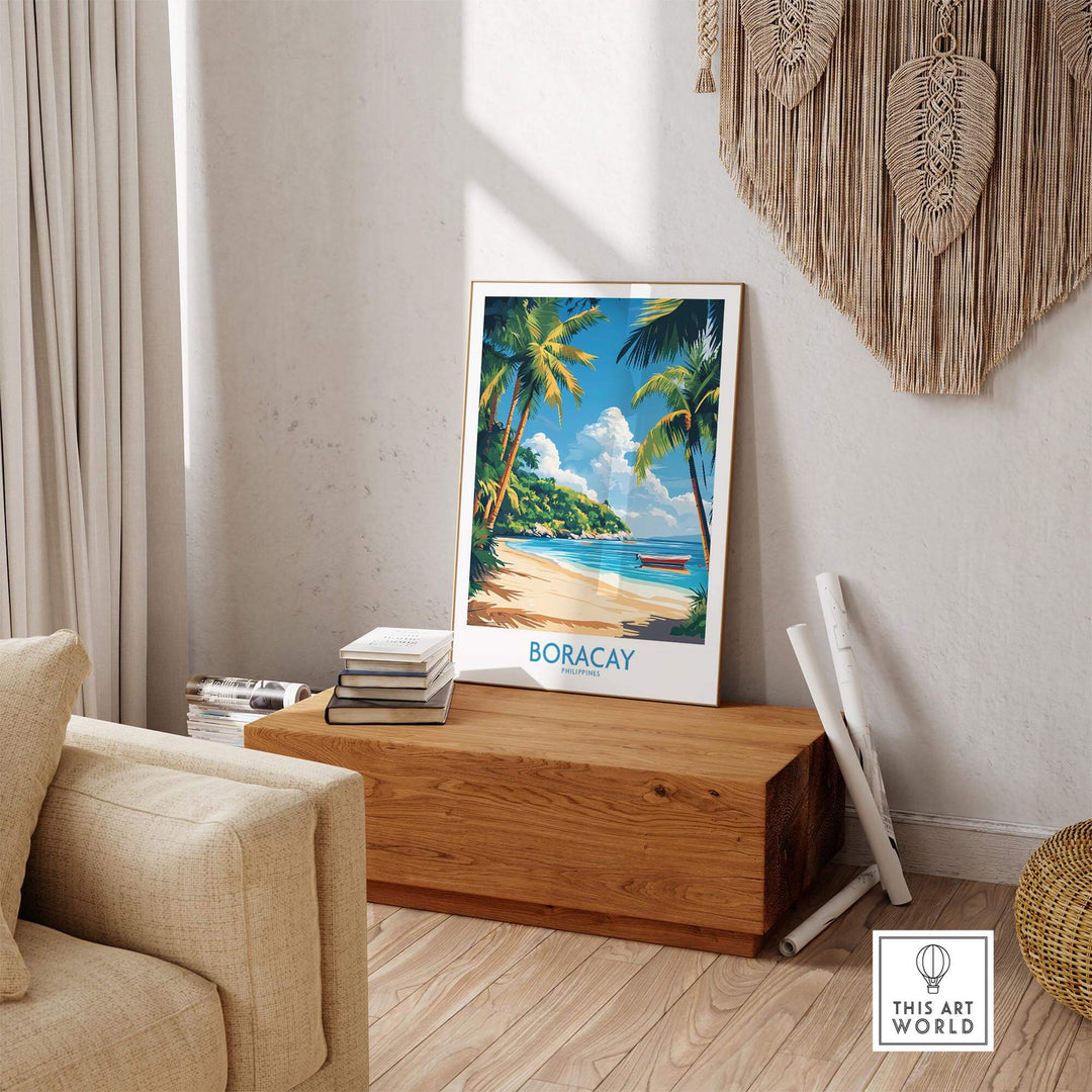 Emportez avec vous un morceau de paradis tropical avec notre affiche murale Boracay Philippines ! Cette affiche présente une vue imprenable sur la célèbre plage blanche, avec des palmiers en arrière-plan. Apportez une ambiance insulaire à votre maison avec cette affiche imprimée des Philippines.