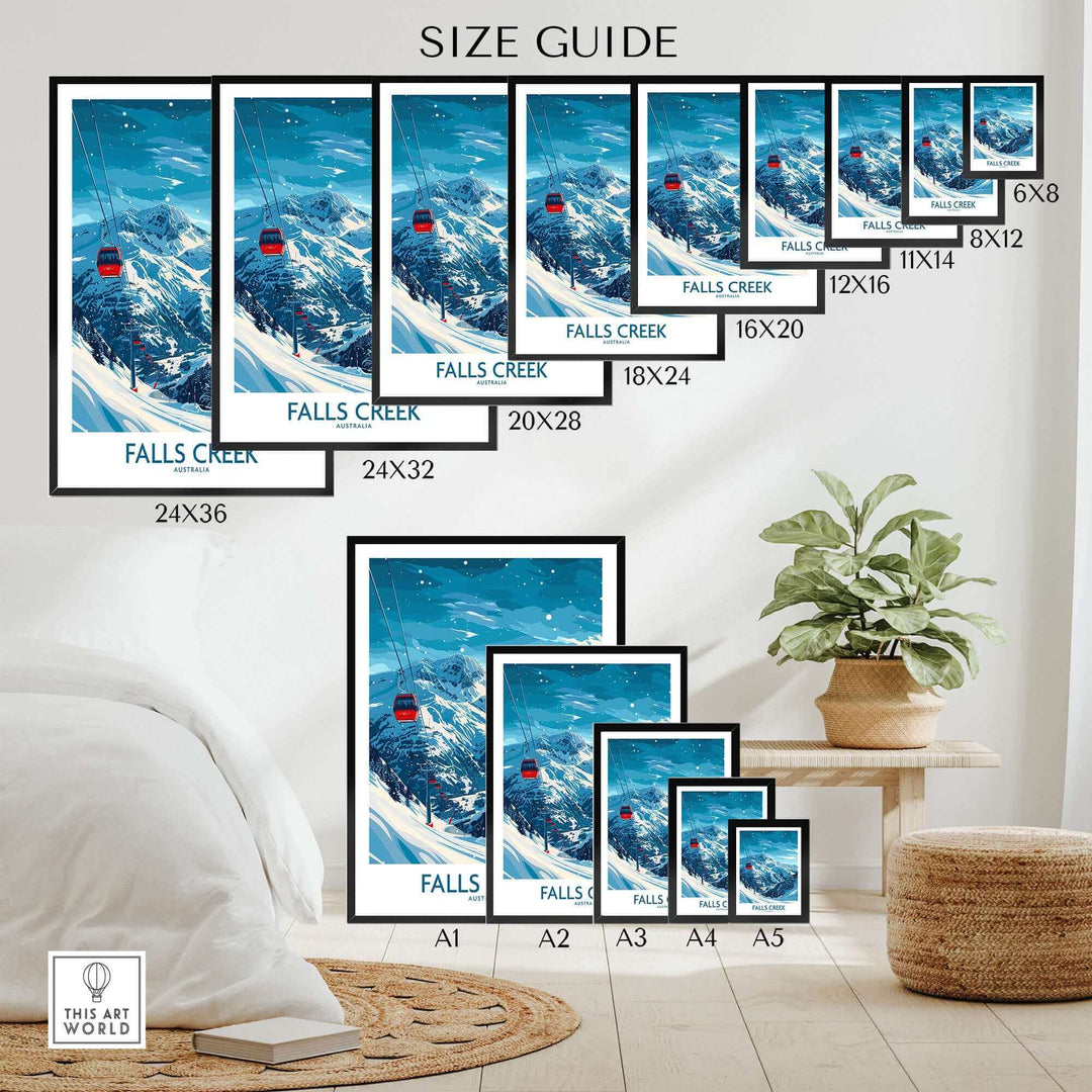 Size guide showcasing various dimensions for Falls Creek Ski Print wall art in a cozy living room setting.