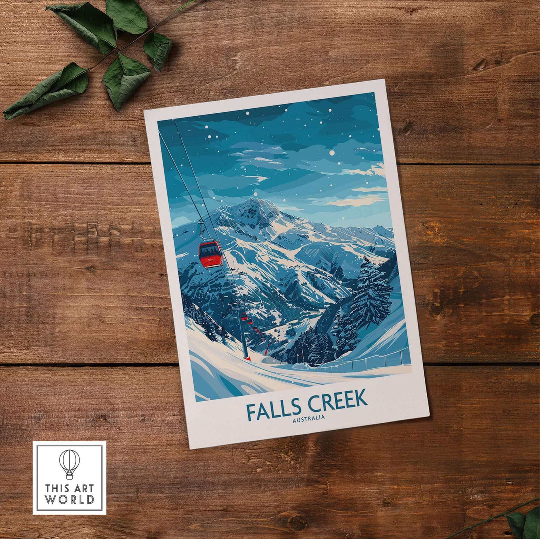 Falls Creek Ski Print among travel-themed wall art, showcasing skiing in Australia and vibrant landscapes.