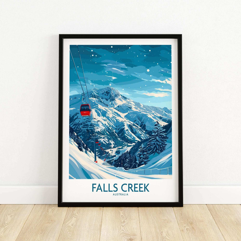 Falls Creek ski print framed on a wall, showcasing a snowy mountain landscape and ski gondola, perfect for ski enthusiasts.